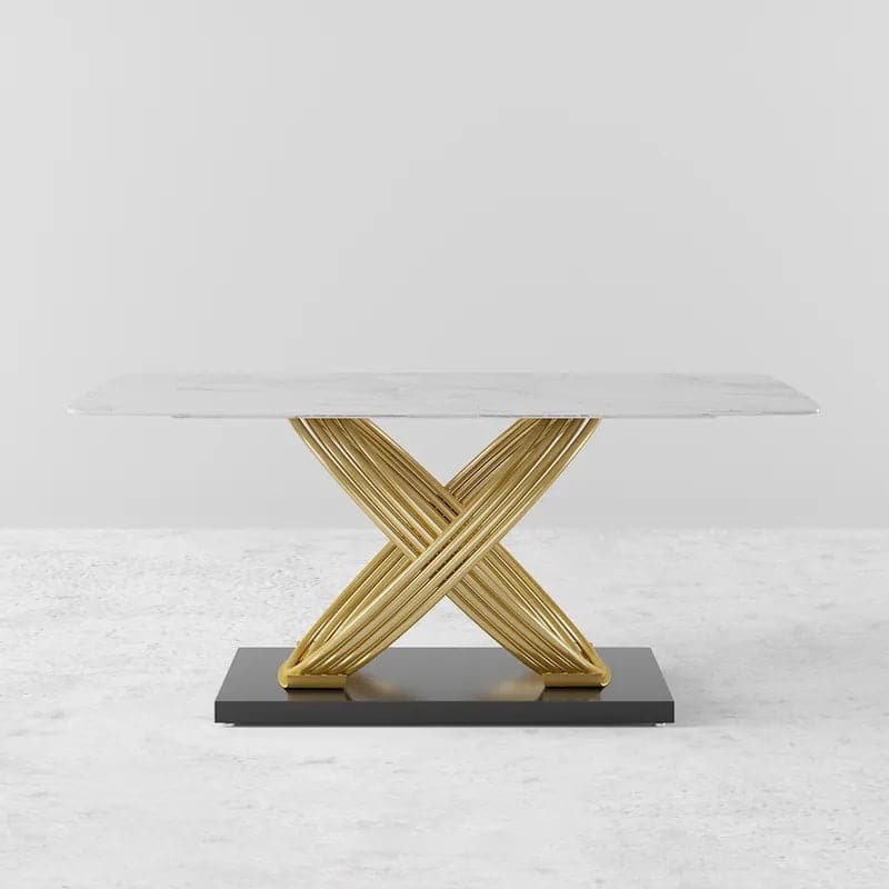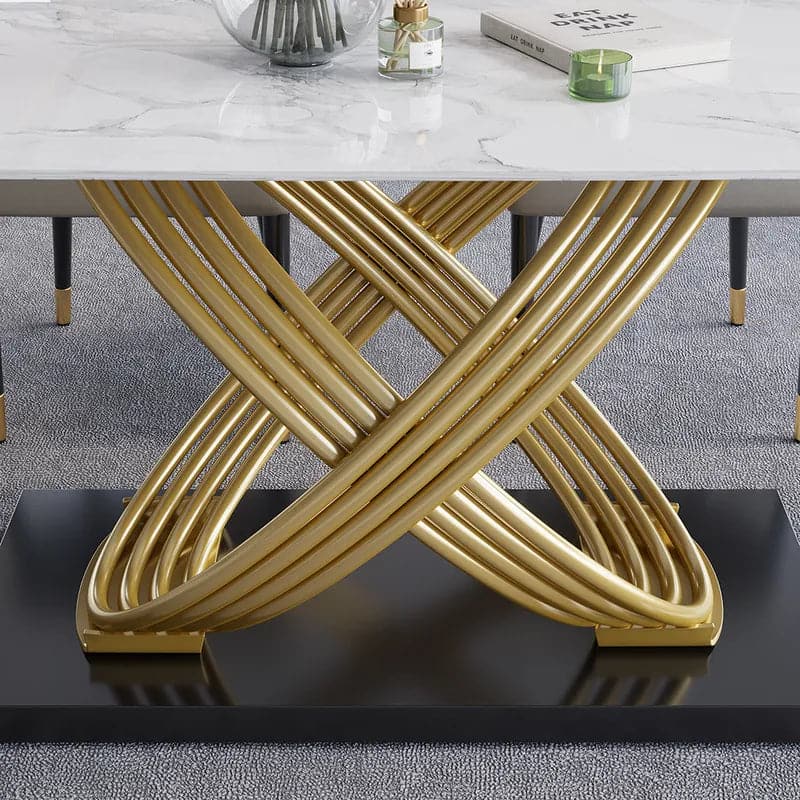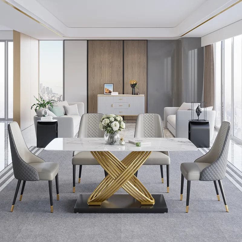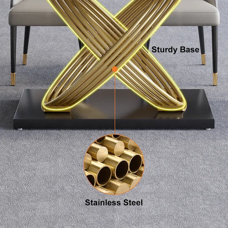 Cette table à manger brille certainement dans une maison moderne en raison de sa surface en travertin de lustre en cristal, elle possède une base centrale en métal qui donne une touche d'existentialisme à sa conception globale en raison de sa base de piédestal circulaire en croix sur un morceau de faux marbre, tandis que sa forme le rend facile à intégrer dans des espaces minuscules. Cette magnifique et pratique table flexible deviendra bientôt une pièce maîtresse de votre décoration lorsque vous souhaiterez vous réunir entre amis. L'adaptabilité de cette table à manger en fait le complément idéal à votre maison, que vous l'utilisiez pour des repas réguliers ou que vous accueilliez un grand groupe de 6 personnes. La table à manger offre un choix d'assise chaleureux et accueillant avec son confort attrayant et son apparence saisissante et somptueuse ; cette pièce apportera un raffinement à votre salle à manger.