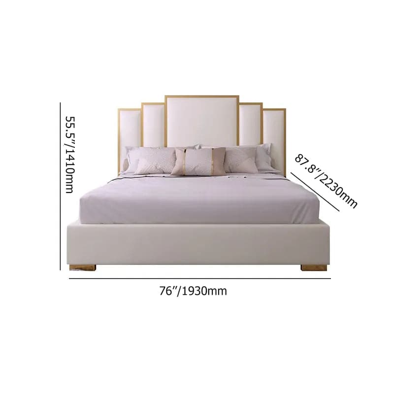 Lit plateforme blanc en simili cuir, très grand lit avec tête de lit rembourrée géométrique