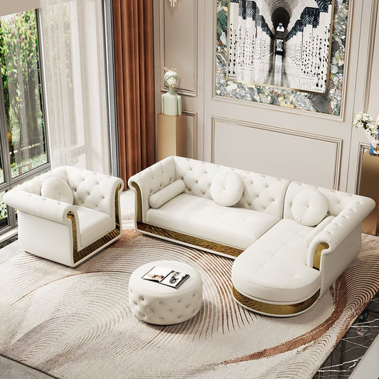 Dodiy Modern L-Shaped White Tufted Corner Sectional Sofa 6-Seater with Ottoman & Pillows