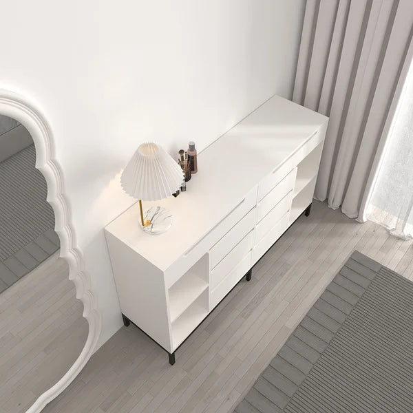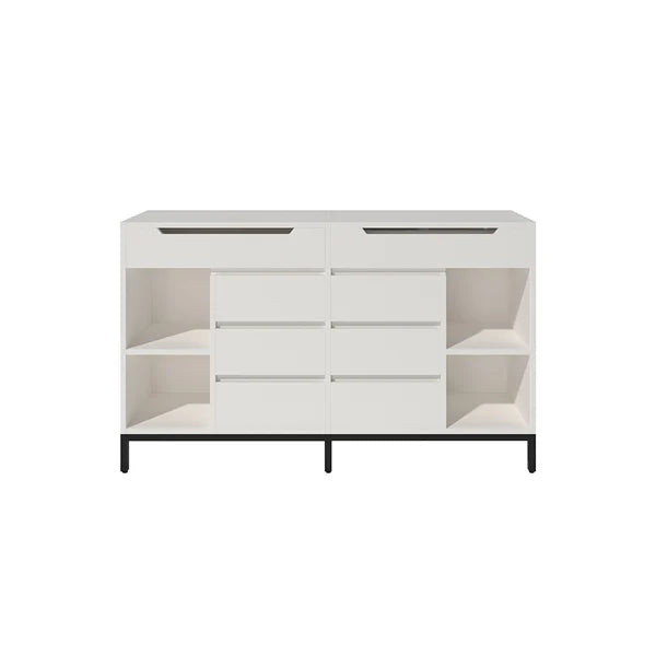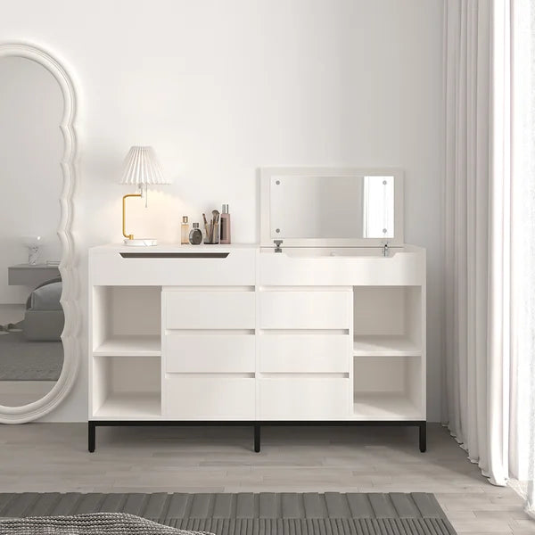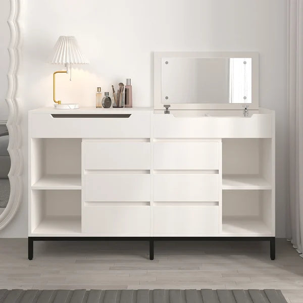 Commode double moderne blanche à 8 tiroirs de 59 po avec miroir rabattable et étagères