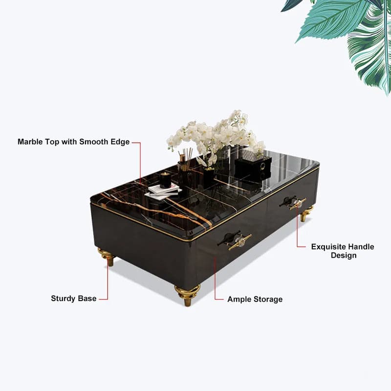 Cette table présente des caractéristiques néoclassiques modernes et est magnifiquement détaillée avec un plateau en marbre de luxe qui reflète les reflets chatoyants. Le plateau en marbre lisse offre un perchoir parfait pour les livres, les magazines, c'est également un perchoir idéal pour les collations et les boissons. La pièce dispose de quatre tiroirs, suffisamment grands pour ranger vos petits trésors. C'est une pièce épurée qui se démarquera devant un canapé aux dimensions généreuses.