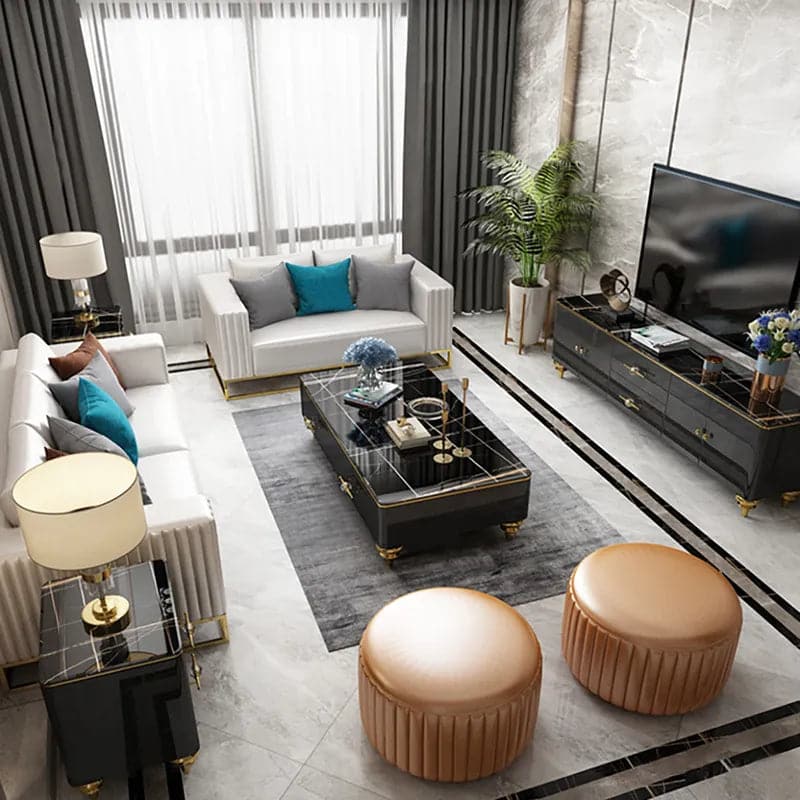 Table basse moderne en marbre blanc/noir de 51 po et tiroirs de rangement, pieds en acier inoxydable doré