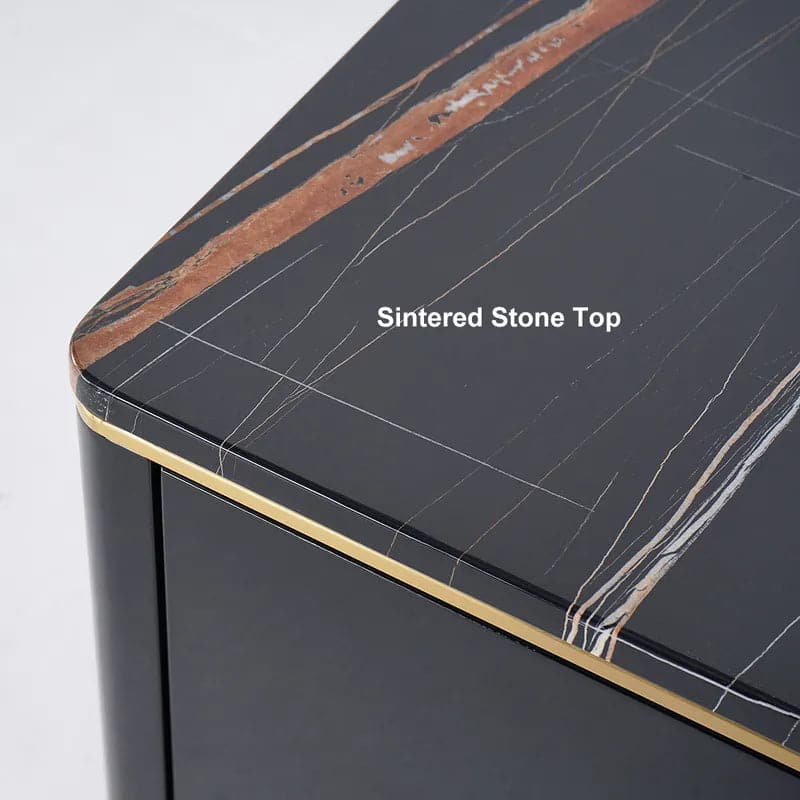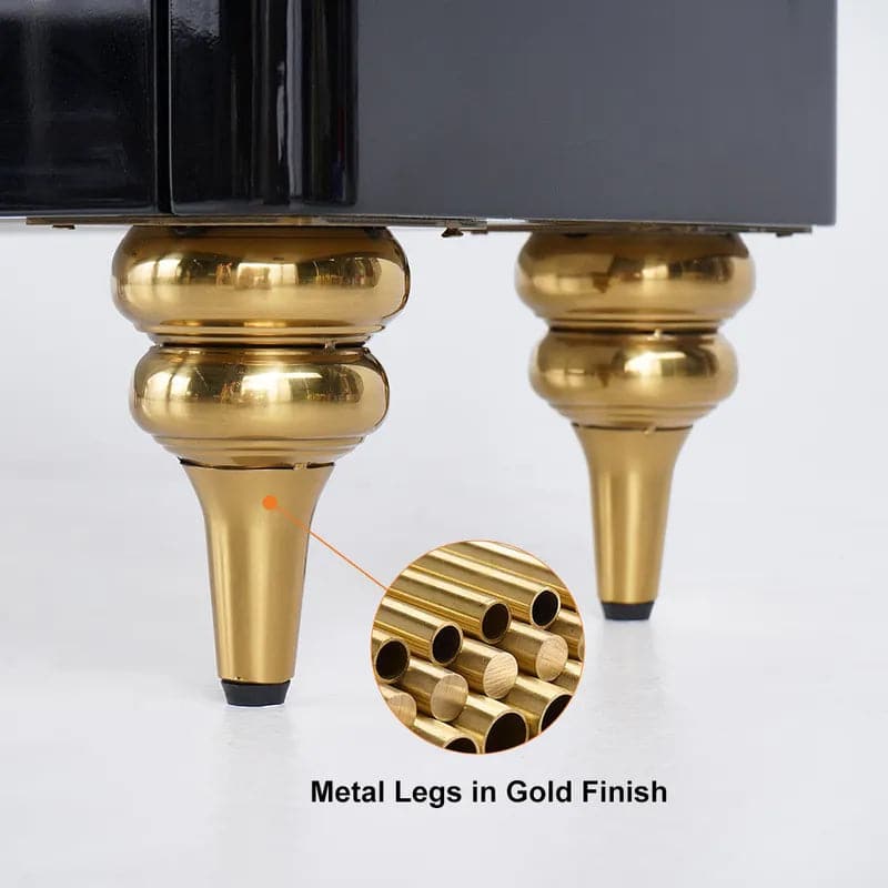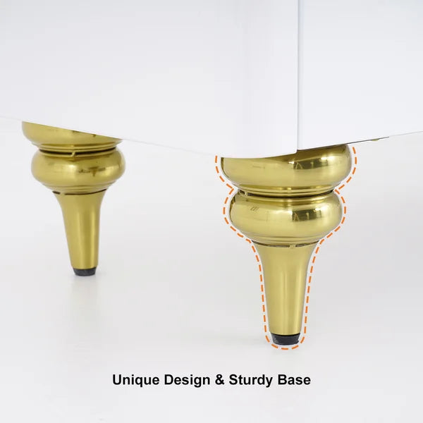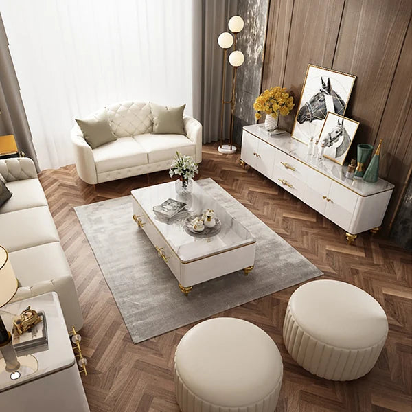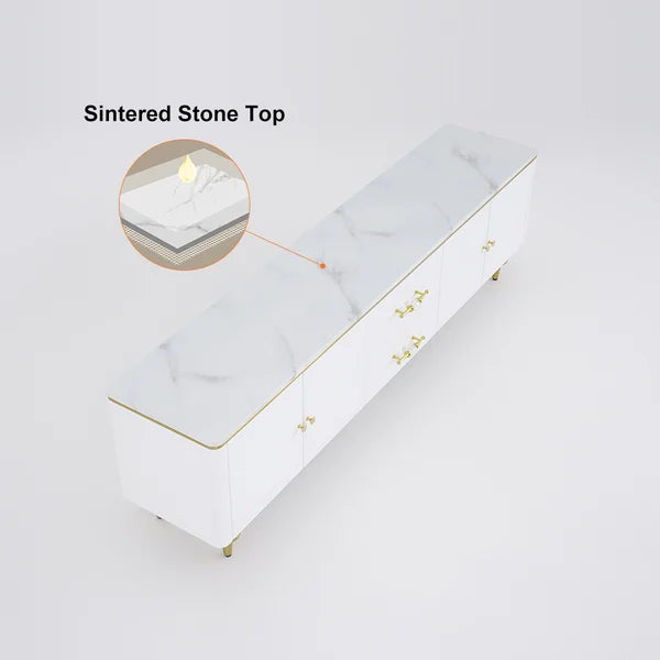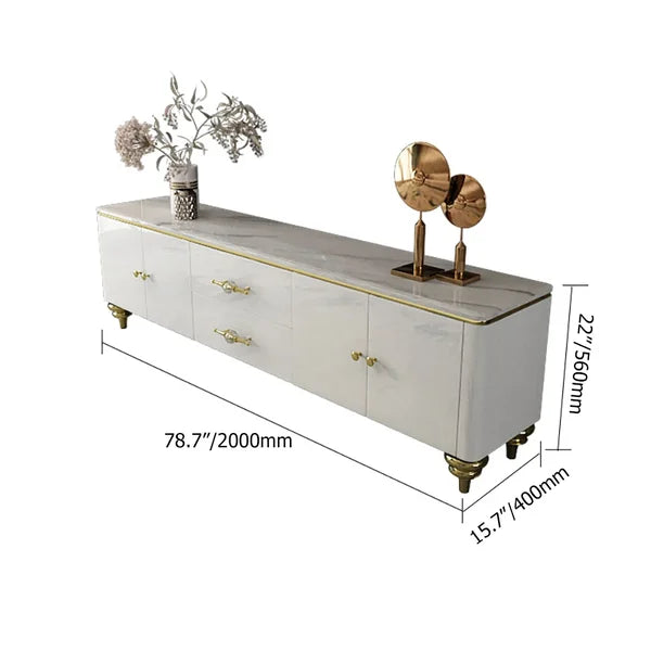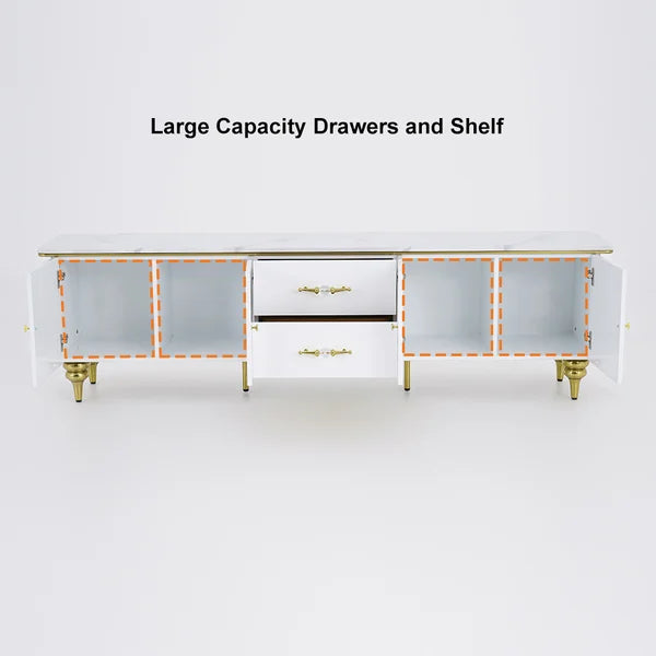 Une silhouette ronde et lisse avec un plateau en faux marbre exquis, un placage en verre trempé, une surface laquée brillante et des poignées au fini doré accrocheur, le meuble TV est un incontournable pour la mise à jour des espaces de vie et des espaces de divertissement. Il comporte 4 portes et 2 tiroirs, ce qui vous permet d'exposer et d'organiser facilement des consoles multimédia, des plantes succulentes et bien plus encore. Ce centre de divertissement est fabriqué à partir de bois de première qualité, d'acier inoxydable et de faux marbre, ce qui rend cette excellente pièce durable, robuste et belle pour les années à venir.