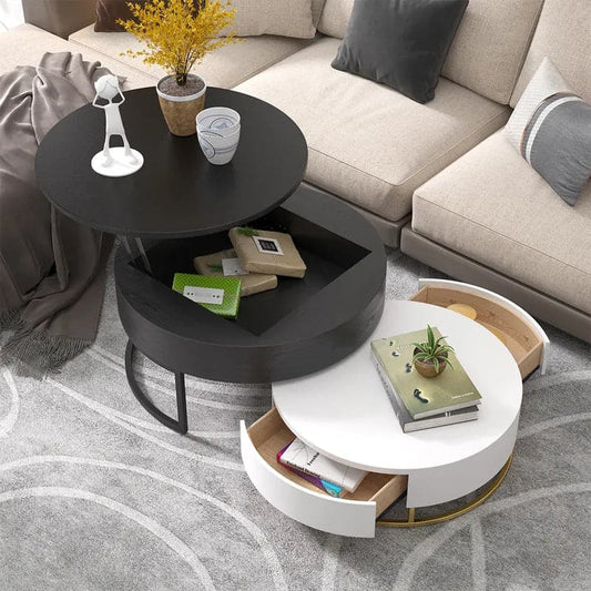 Table basse gigogne ronde en bois blanc et noir avec tiroirs rotatifs blanc et noyer