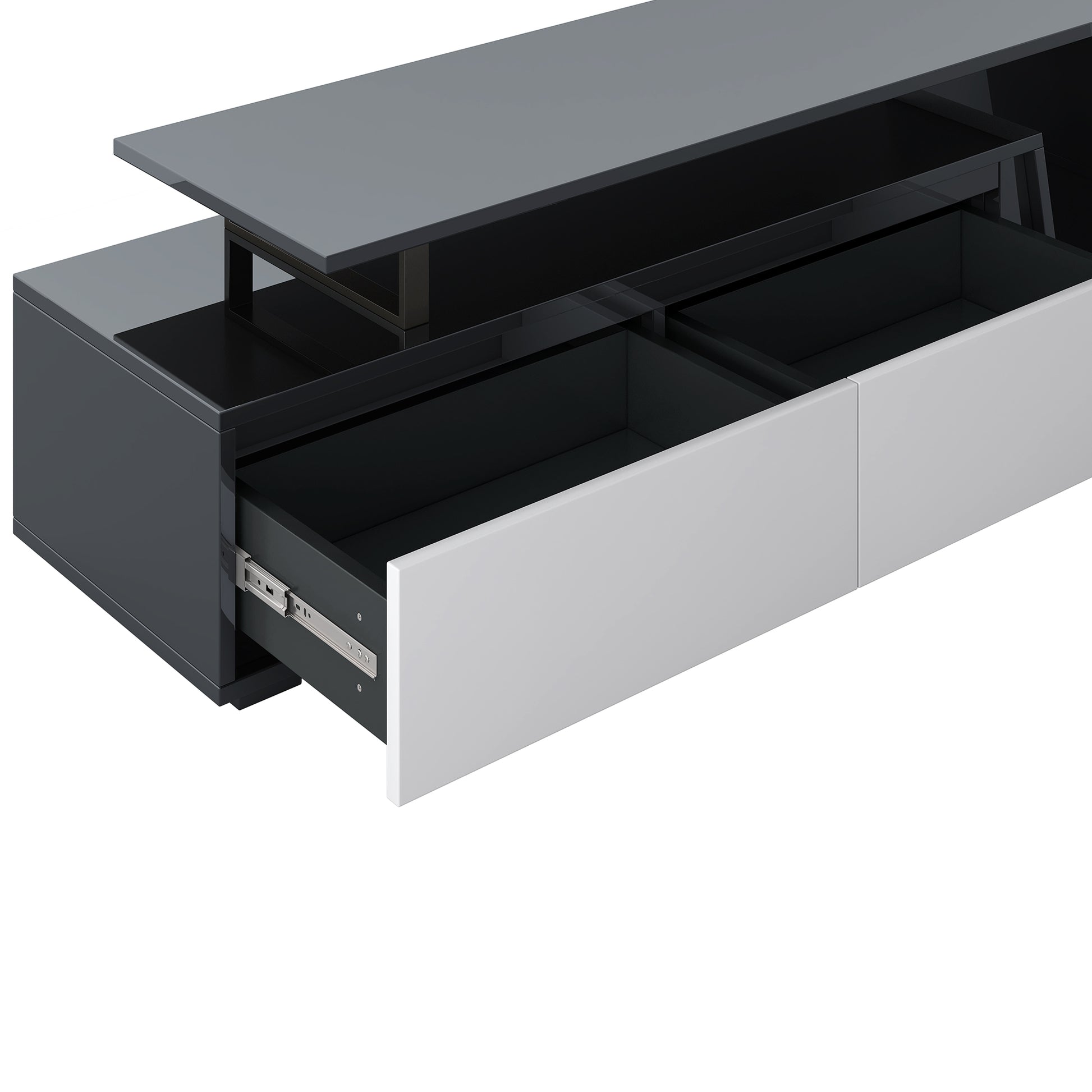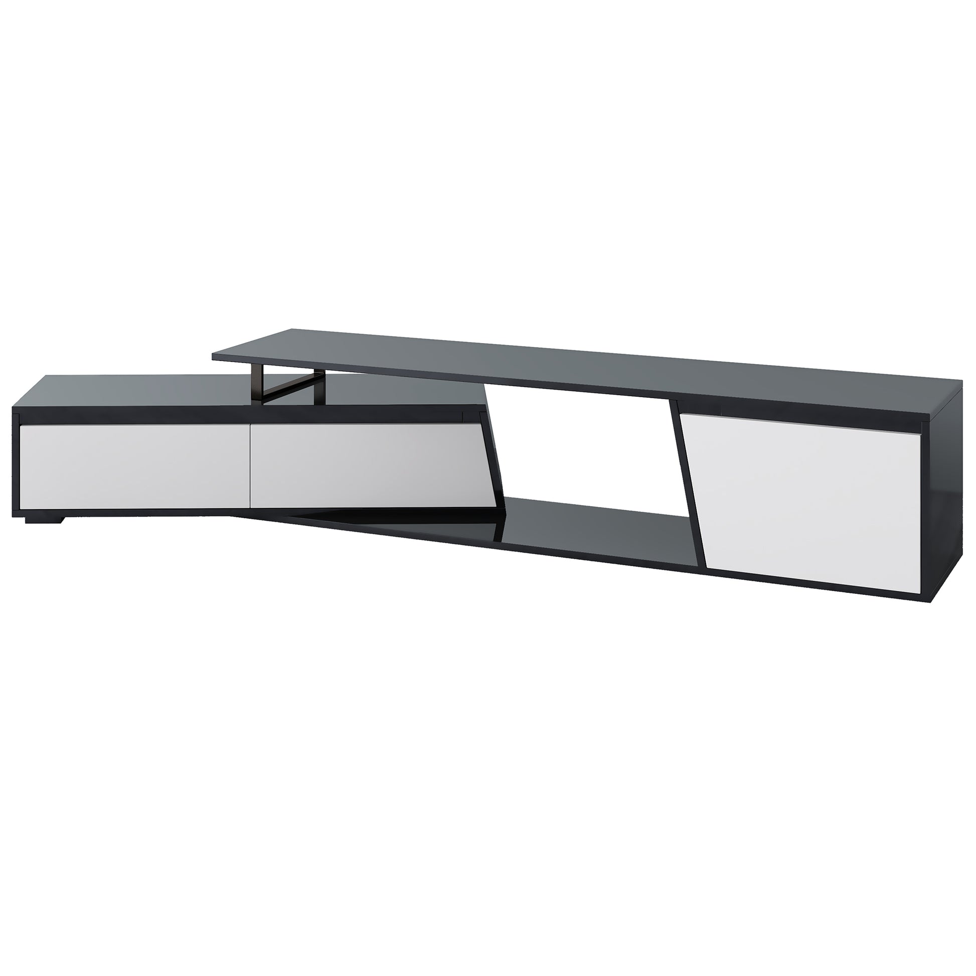 Inspired by the art of asymmetrical, this extendable contemporary TV stand is is definitely a highlight of your living room. It features two ample drawers and one cabinet to keep DVDs, magazines, blankets, toys or other essentials tidy. Made of high-quality particle board with high-glossy surface, this stylish TV is the perfect choice for your living room and bedroom. Can accommodate up to an 100-inch TV.
