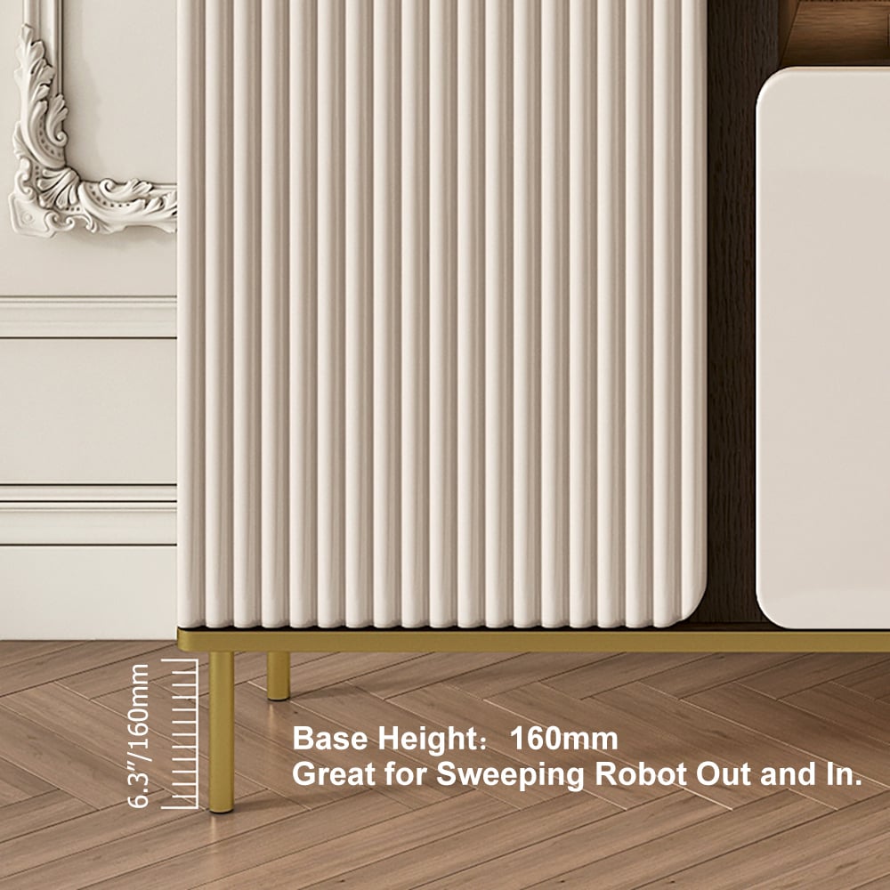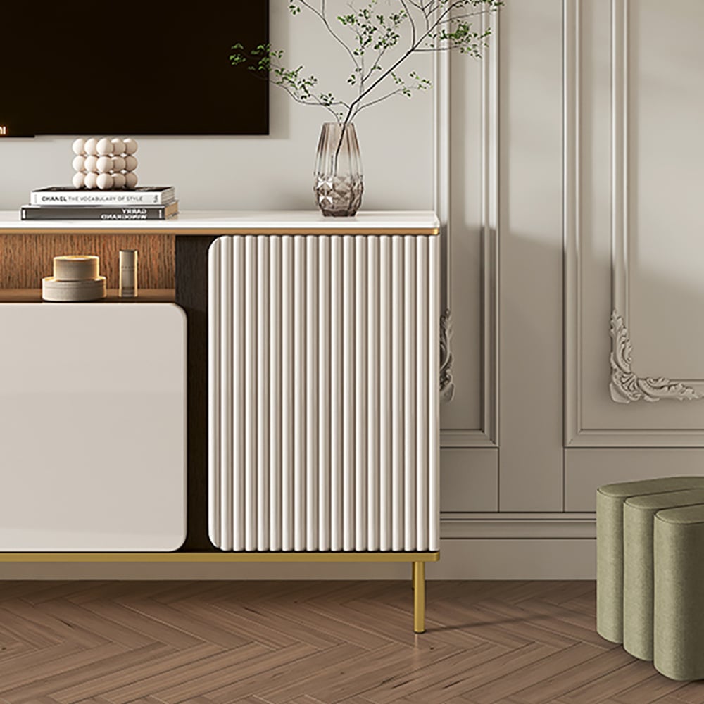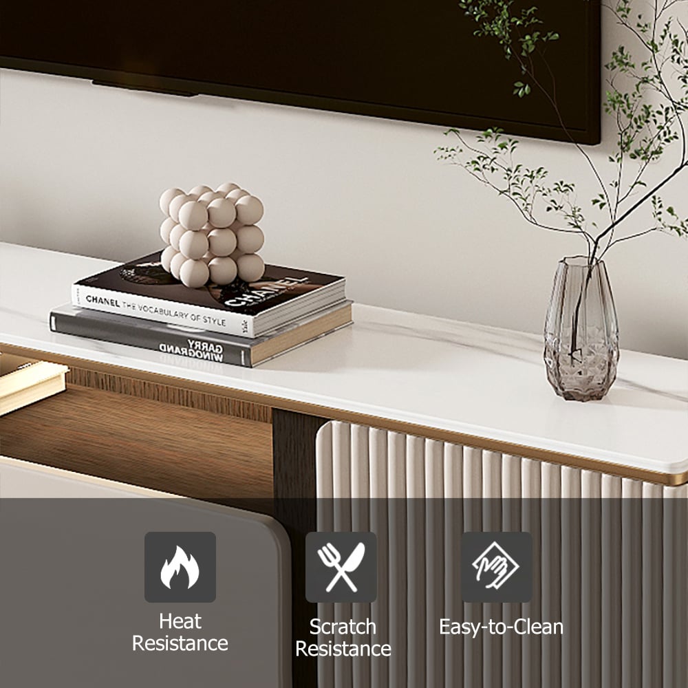 This TV cabinet carries a hard and easy-to-clean sintered stone top, enough storage space to store your needs, clean lines, modern design that will complement beauty in your home decor, sturdy construction, and thickened legs that ensure excellent stability and durability.