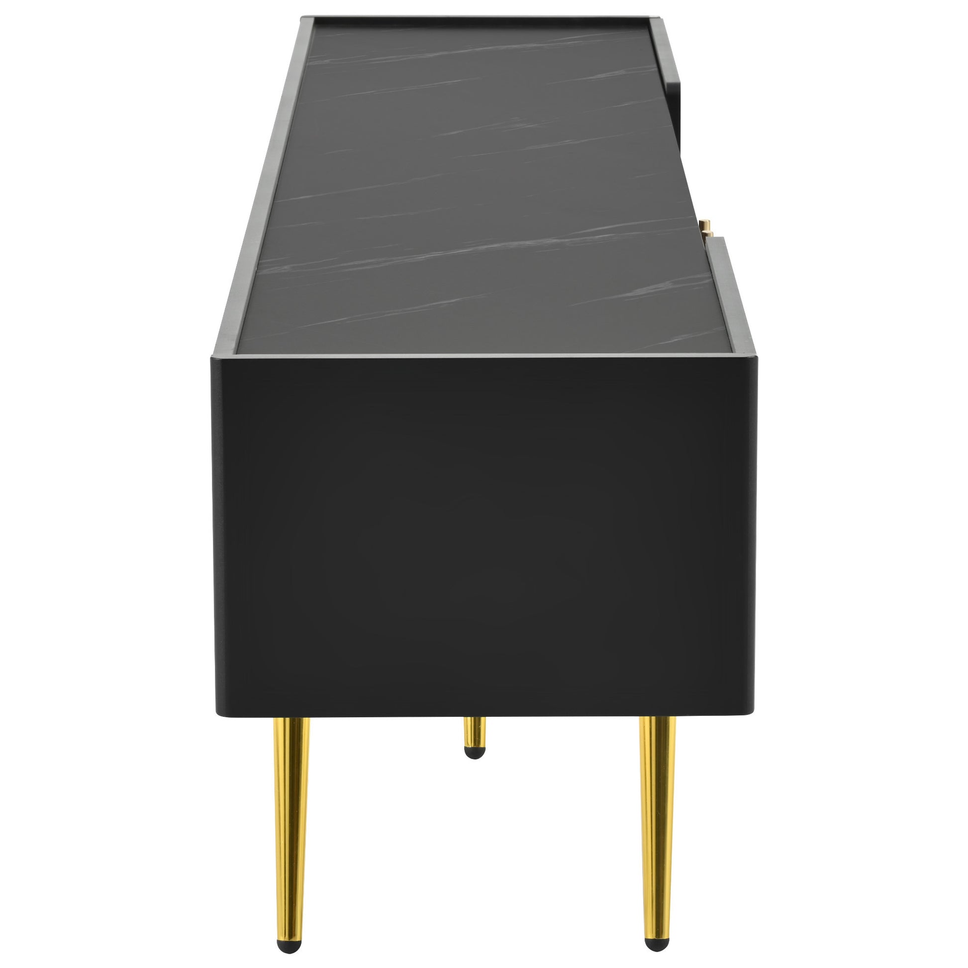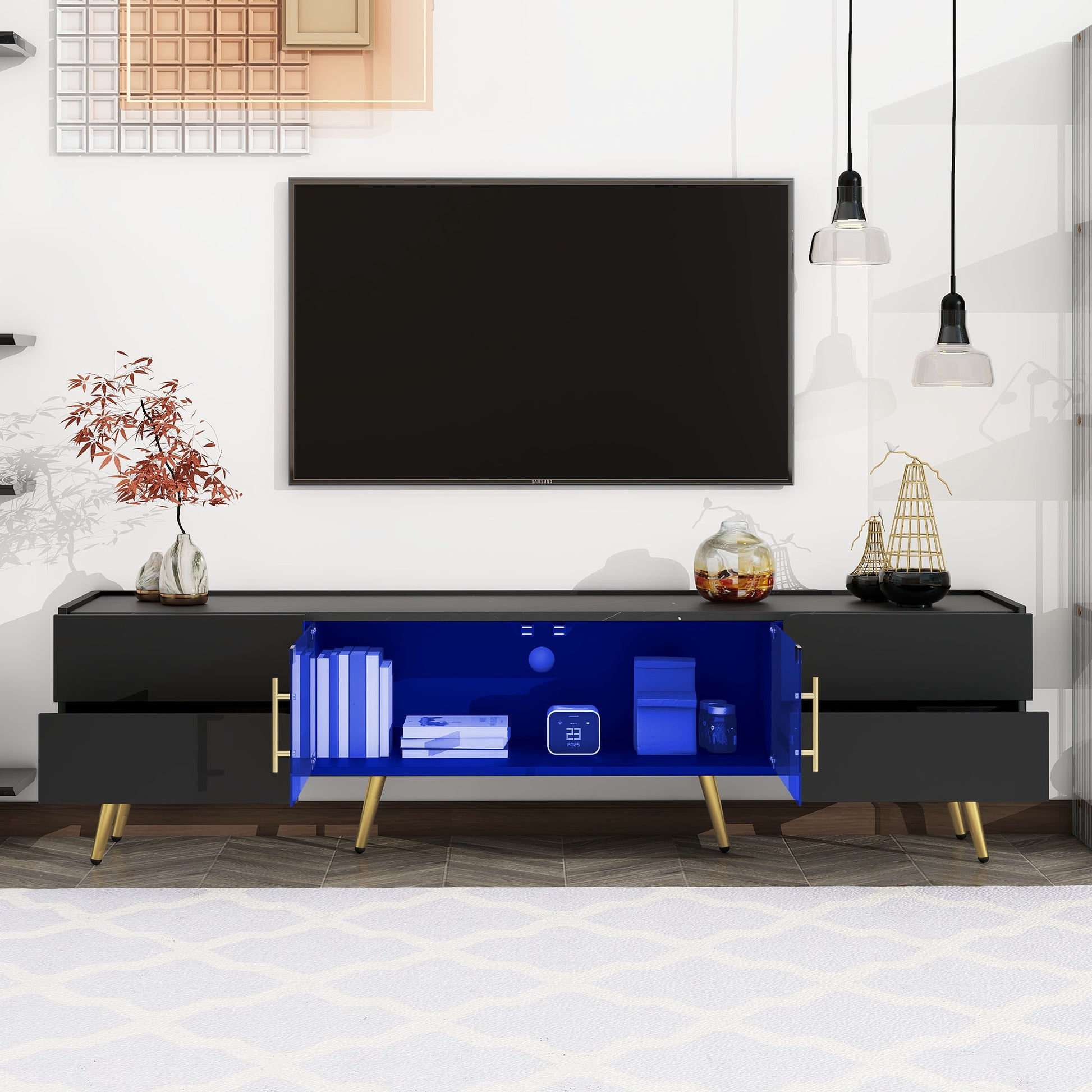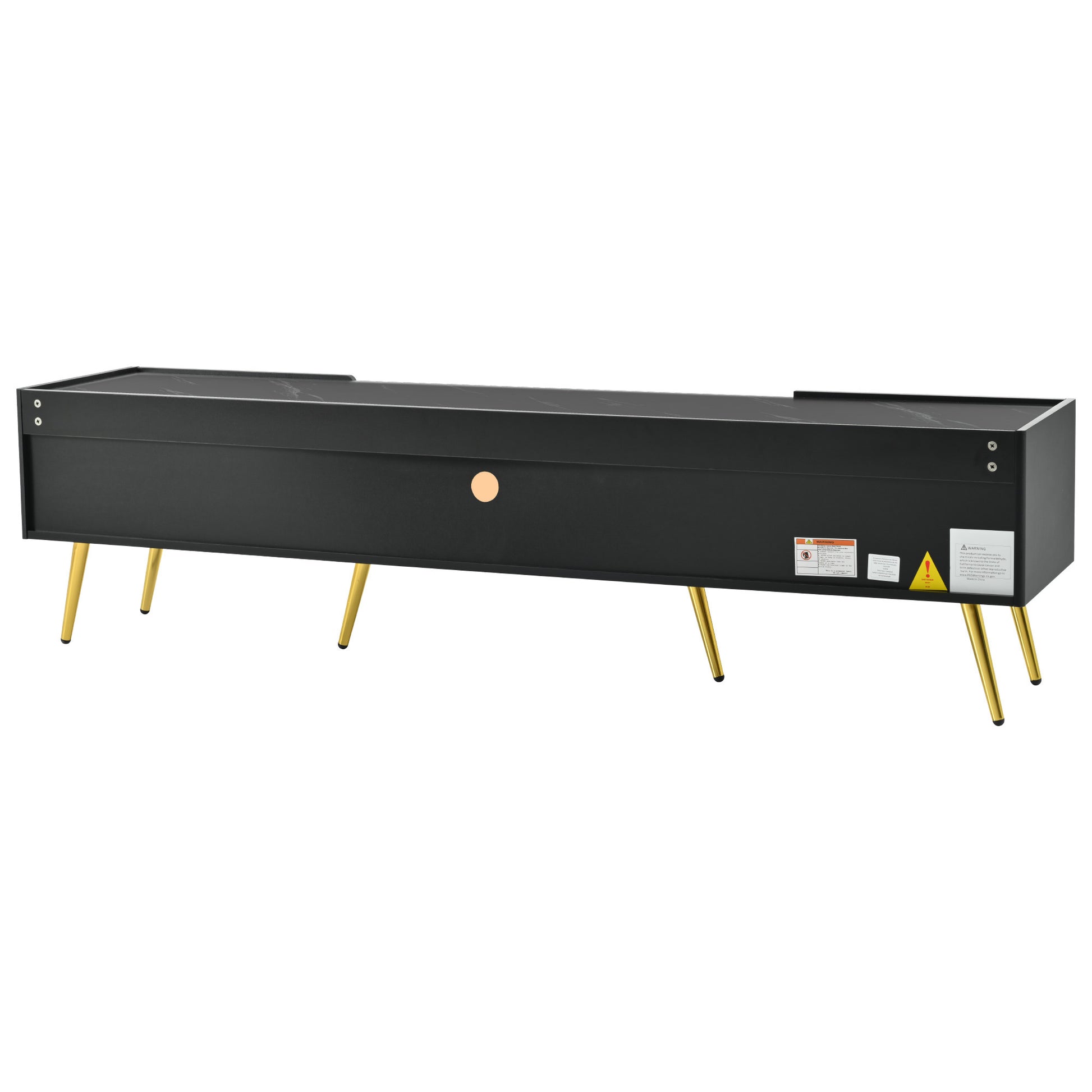 • The combination of marble-patterned top, LED lights, brown glass doors, metal legs and handles gives this TV cabinet a sophisticated look that will elevate the decor of any living room or entertainment space.