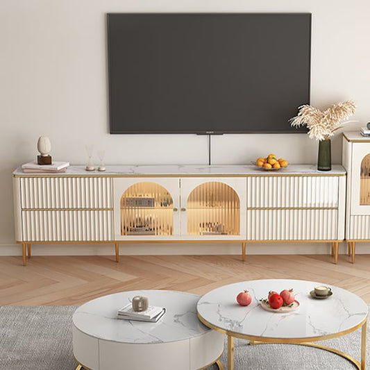 Meuble TV en pierre cannelée avec porte en verre blanc de 80", meuble multimédia en bois pour téléviseur de 85" avec tiroirs
