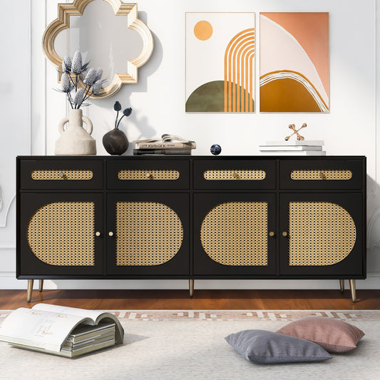Meuble TV de style bohème ON-TREND avec porte en rotin, table console multimédia tissée pour téléviseurs jusqu'à 70", panneau latéral de style campagnard avec base en métal doré pour le salon, noir.