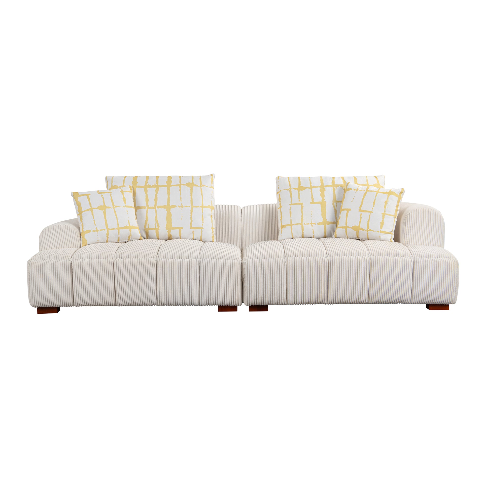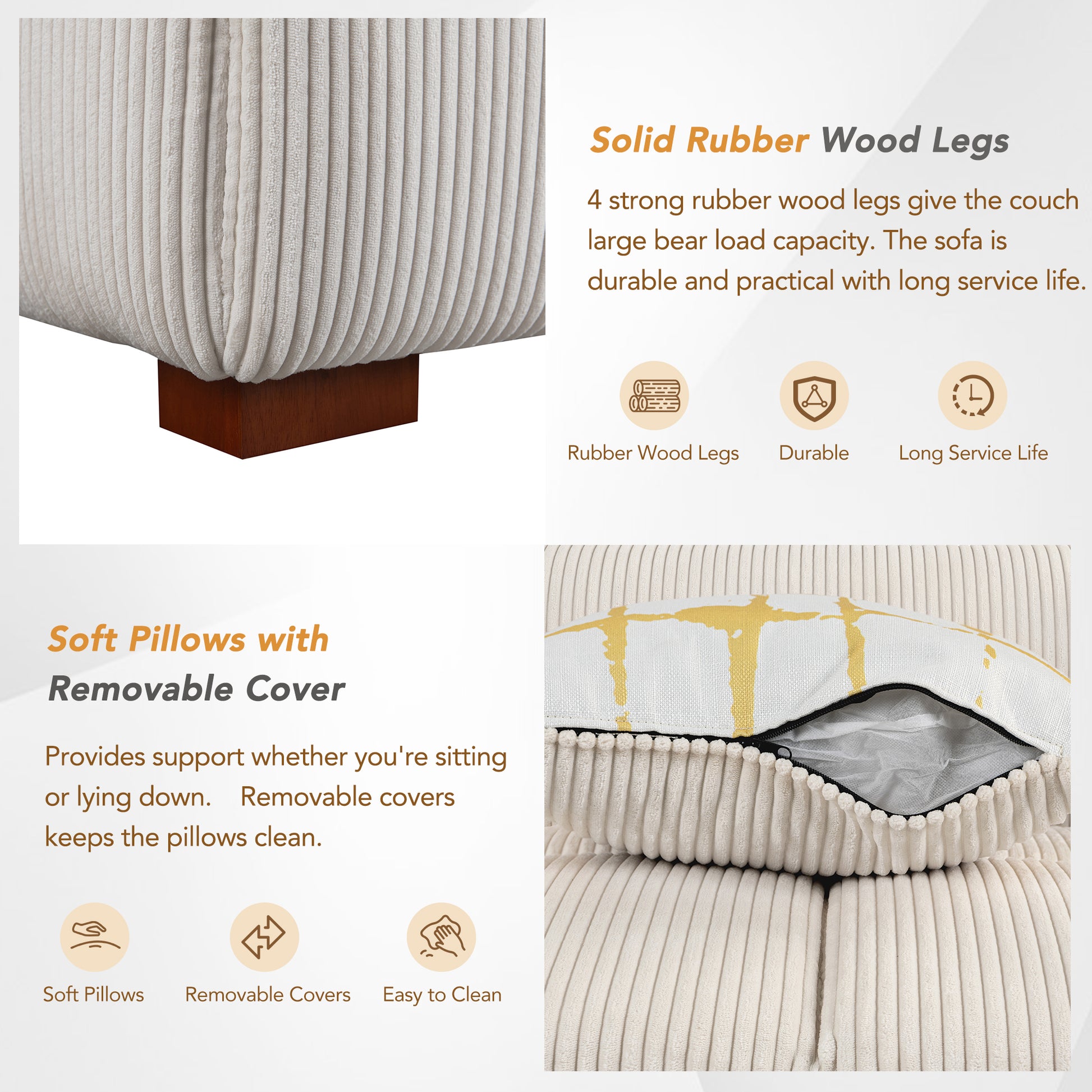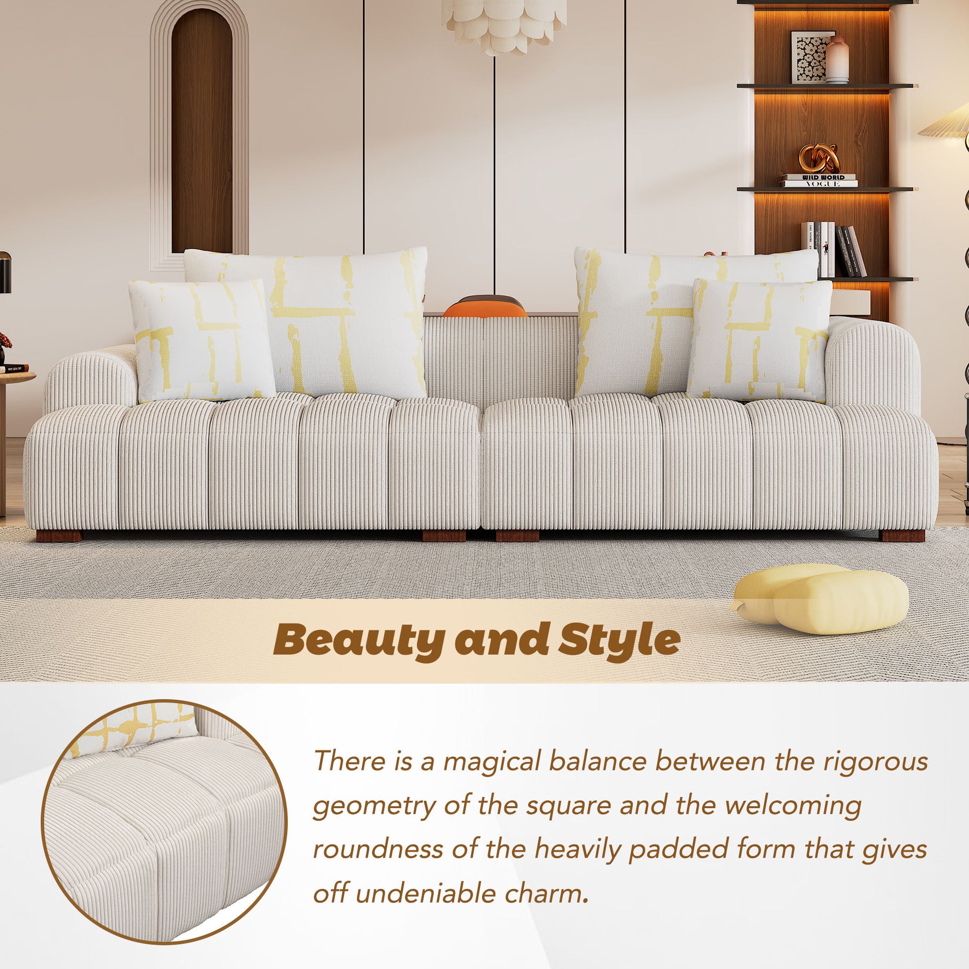 103.9" Modern Couch Corduroy Fabric Comfy Sofa with Rubber Wood Legs, 4 Pillows for Living Room, Bedroom, Office, Beige