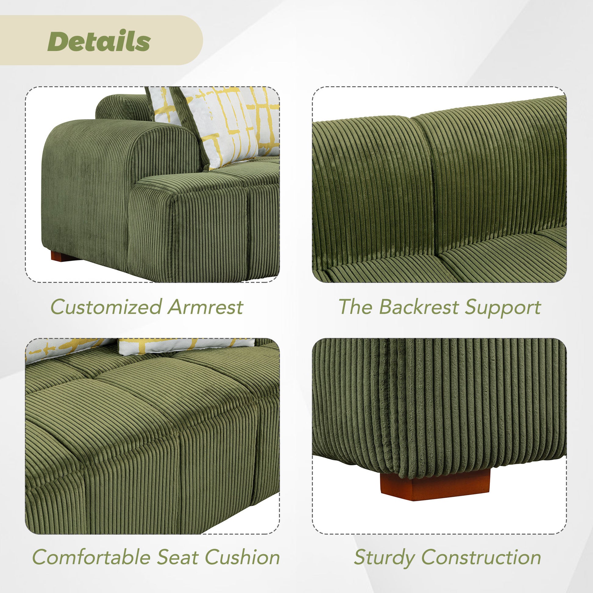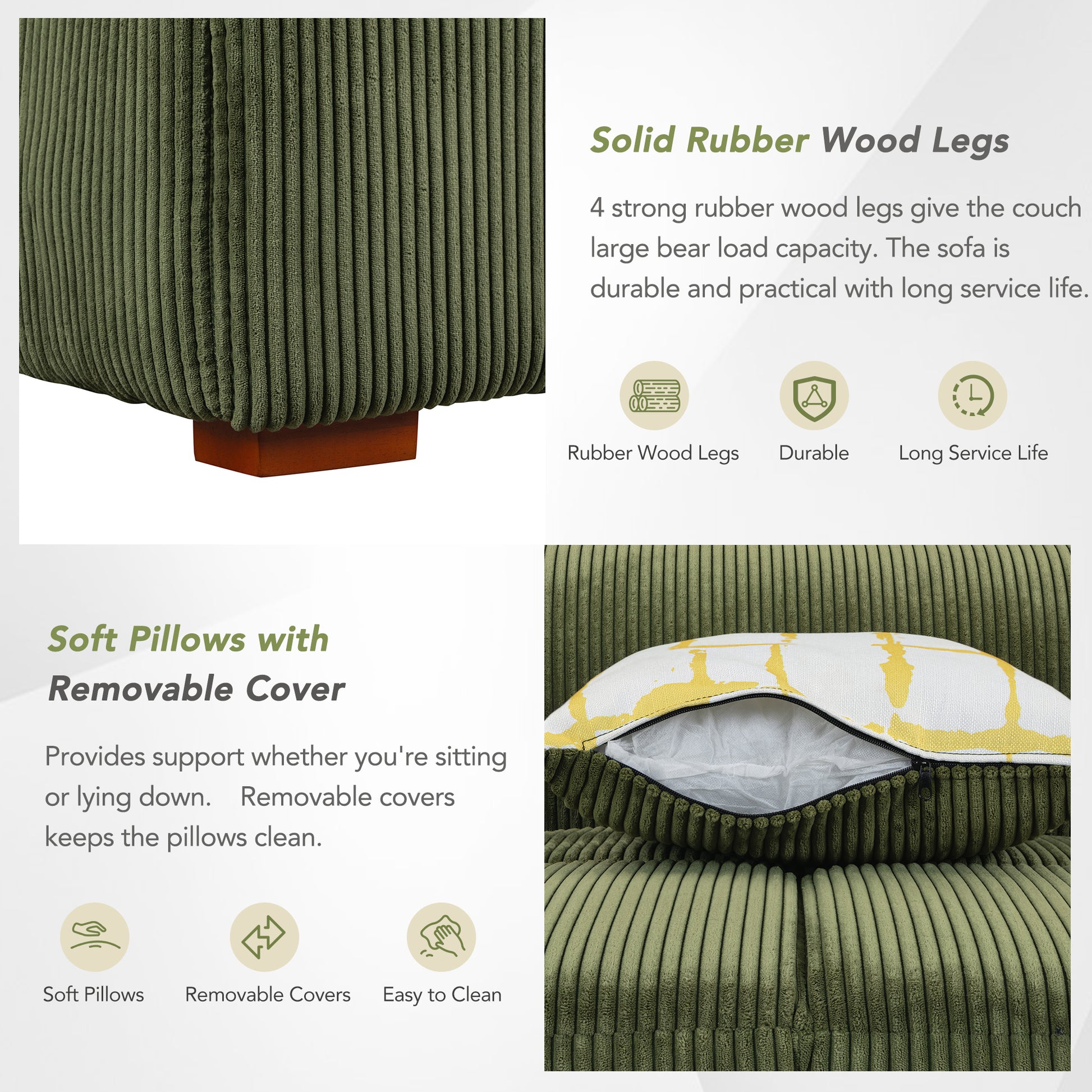 103.9" Modern Couch Corduroy Fabric Comfy Sofa with Rubber Wood Legs, 4 Pillows for Living Room, Bedroom, Office, Green