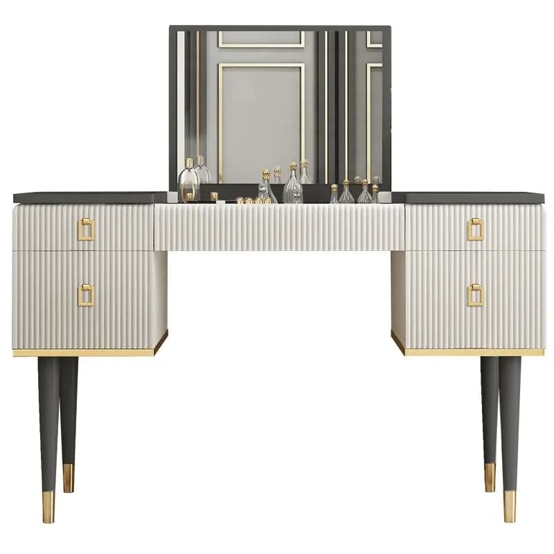 Coiffeuse de maquillage à 4 tiroirs avec miroir rabattable blanc et gris