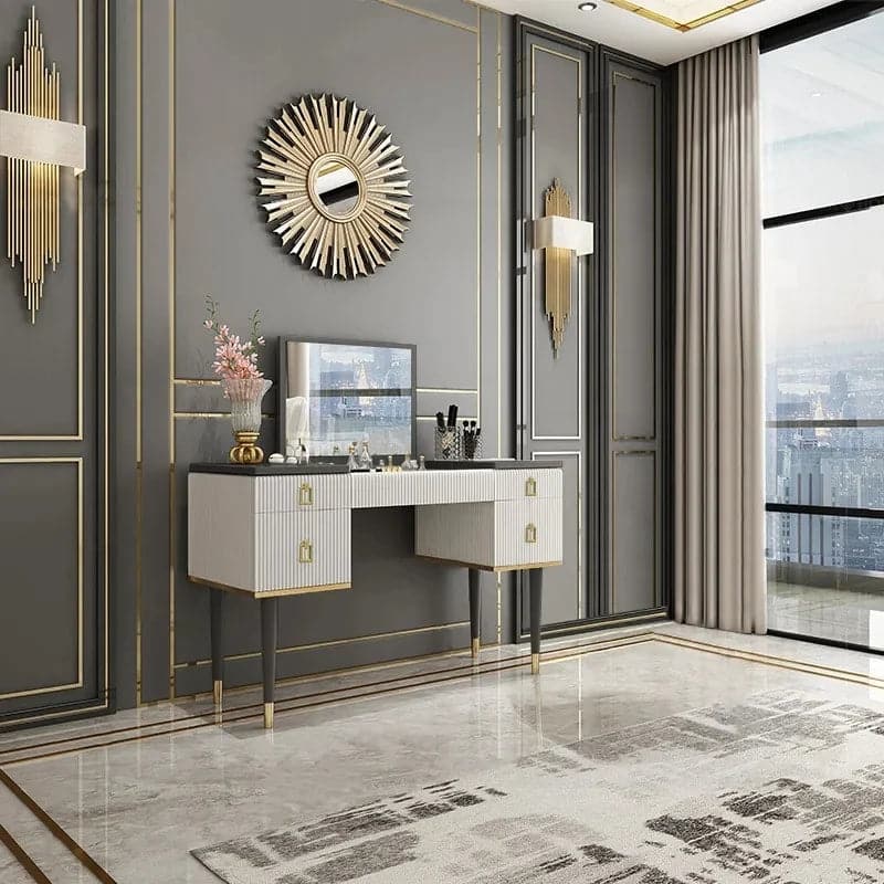 Simple mais tendance, cette jolie coiffeuse est un ensemble de mobilier élégant pour les chambres à coucher. Fabriqué en bois et en métal avec des accents dorés, il présente une silhouette rectangulaire avec des moulures simples, un panneau de miroir central et une base à quatre pieds. Le milieu du dessus du meuble-lavabo se soulève pour révéler un espace de rangement caché avec 4 compartiments pour les bijoux et un miroir éblouissant, tandis que en rabattant le miroir, vous disposerez d'un excellent bureau pour écrire et travailler. Et les 4 tiroirs offrent suffisamment d'espace de rangement pour toutes les petites choses, ce qui vous aide à devenir une personne bien habillée. Cette pièce est suffisamment polyvalente pour se fondre dans la plupart des types de décor tout en faisant une déclaration distincte et élégante.