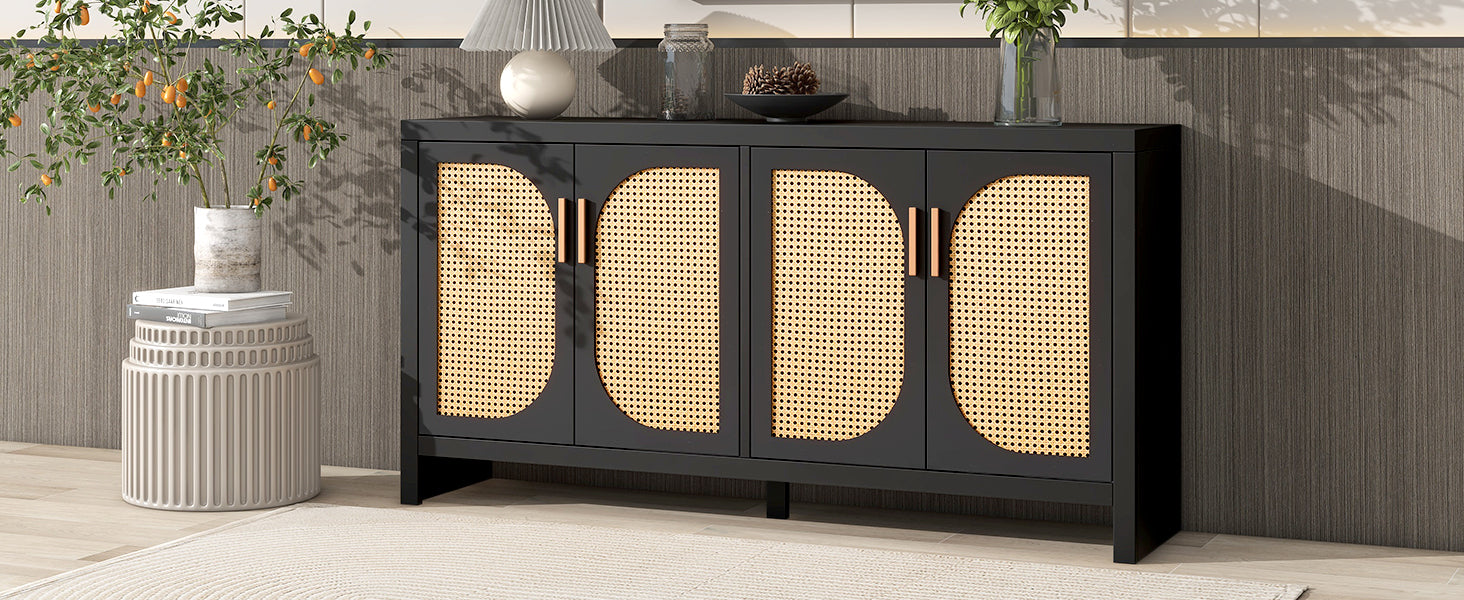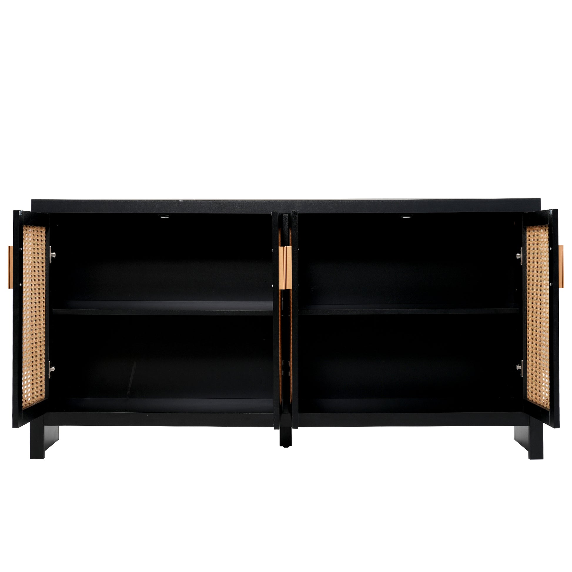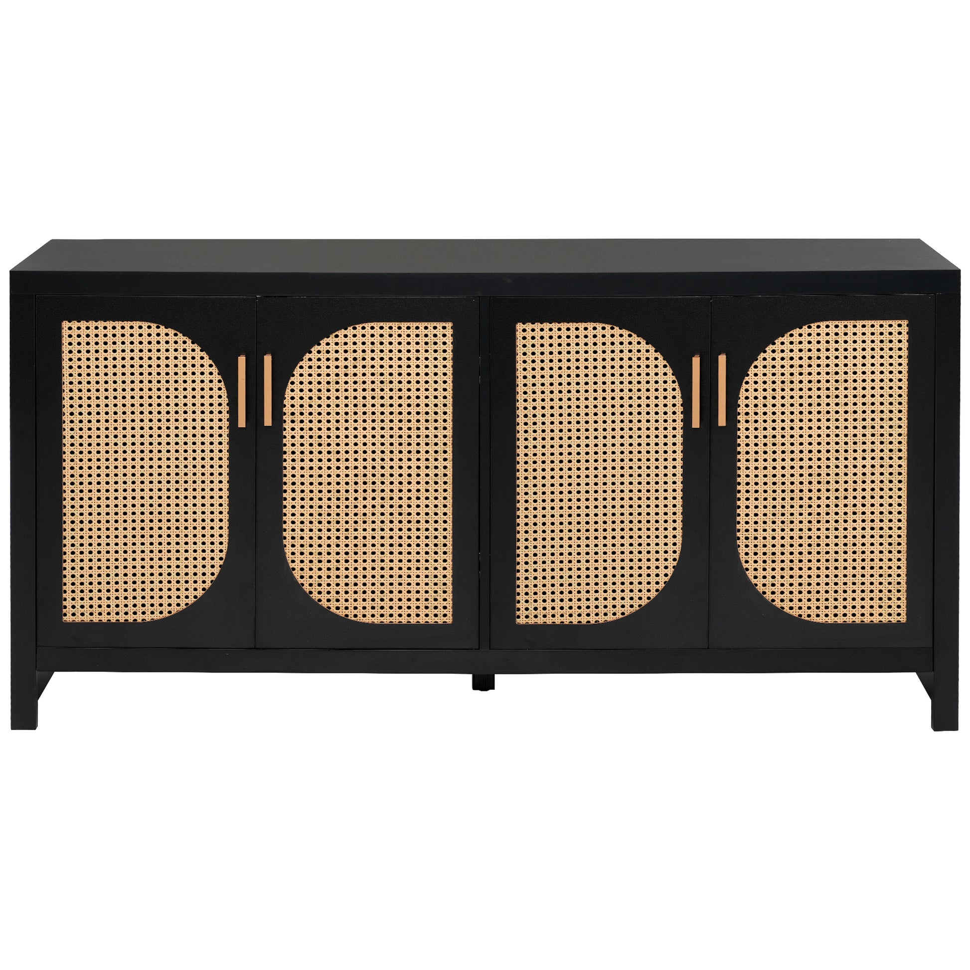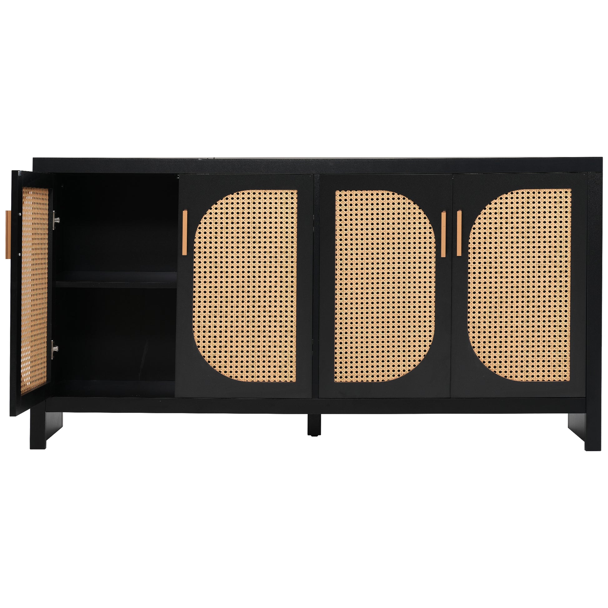 U-Can Modern TV Stand for 65-inch TV with Rattan Doors, Adjustable Shelves and Metal Handles for Living Room, Black