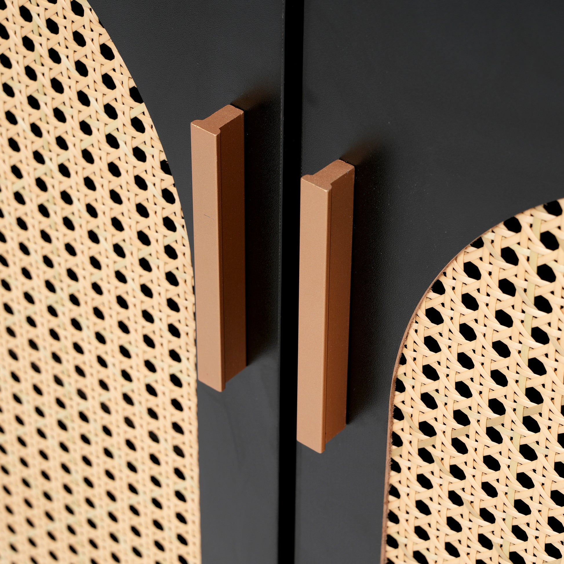 Our modern TV stand with was PE rattan doors provides a unique and natural touch, adding a rustic charm to the overall aesthetic. It features ample storage space, including adjustable shelves, to neatly organize your media devices, DVDs, and other essentials. Crafted from high-quality materials, our TV stand is built to last. Can accommodate up to an 65-inch TV.