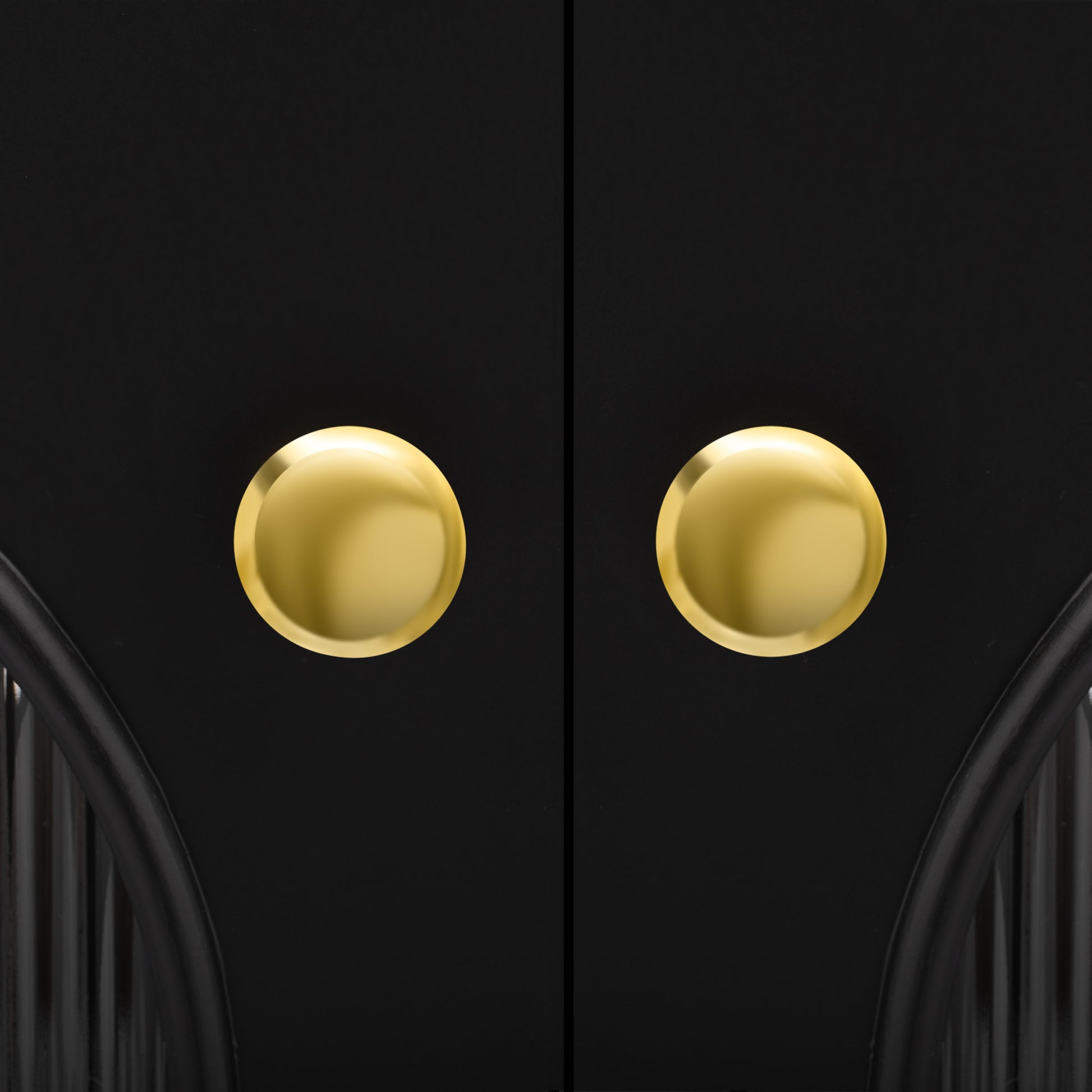 • Each door is equipped with a round gold handle, meticulously designed to complement the overall aesthetic of the cabinet. The gold finish on the legs matches the handles, ensuring a cohesive and elegant look. The addition of a fifth leg in the center ensures extra support, preventing any sagging and maintaining the cabinet's structural integrity over time.