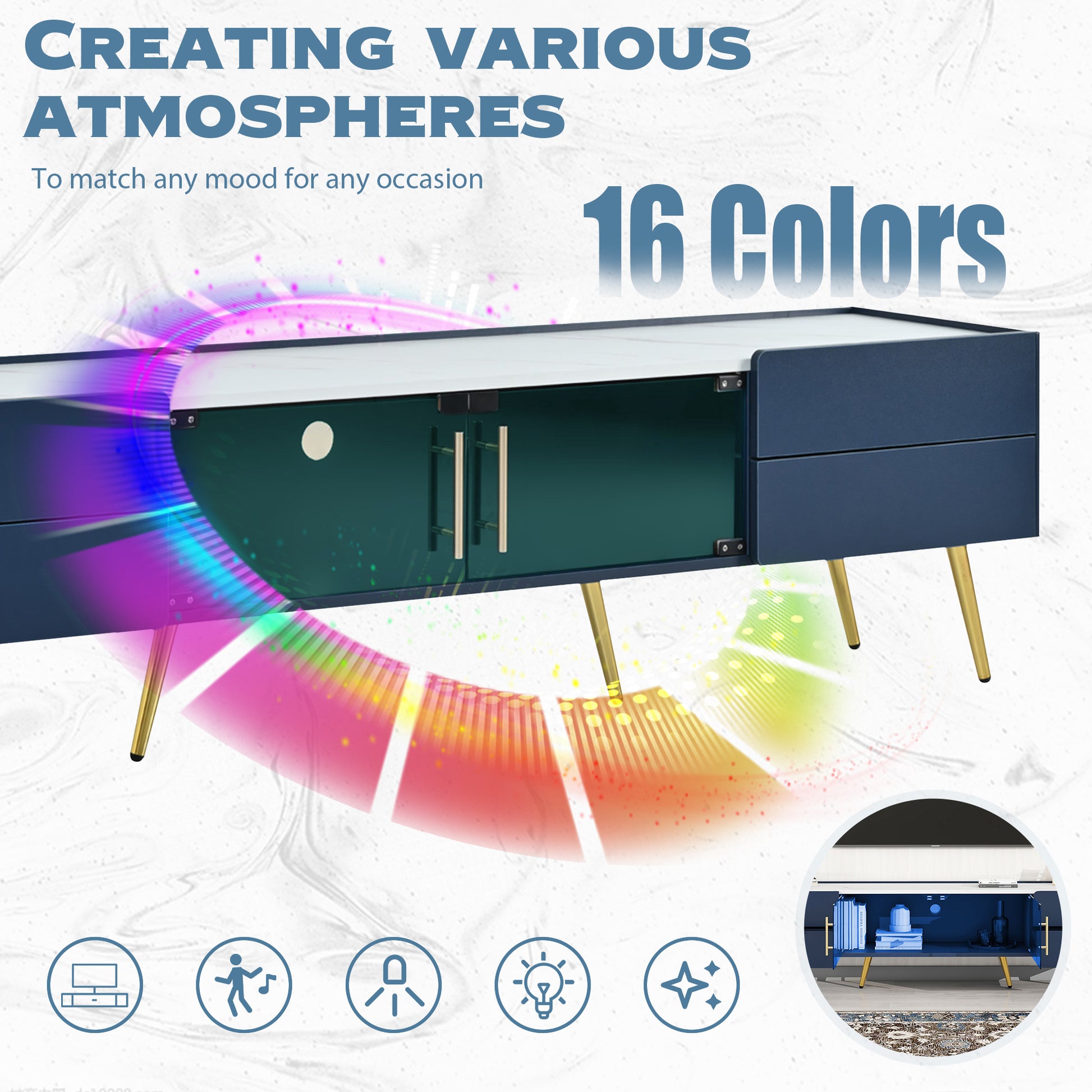Elevate your entertainment experience to unprecedented levels of luxury and sophistication with this gorgeous LED TV stand. It comes with a remote control to cycle through and let you match the mood with 16 different colors of lights. This entertainment centre includes 4 storage drawers and one spacious cabinet to store media, electronics, accessories, books, or decor.