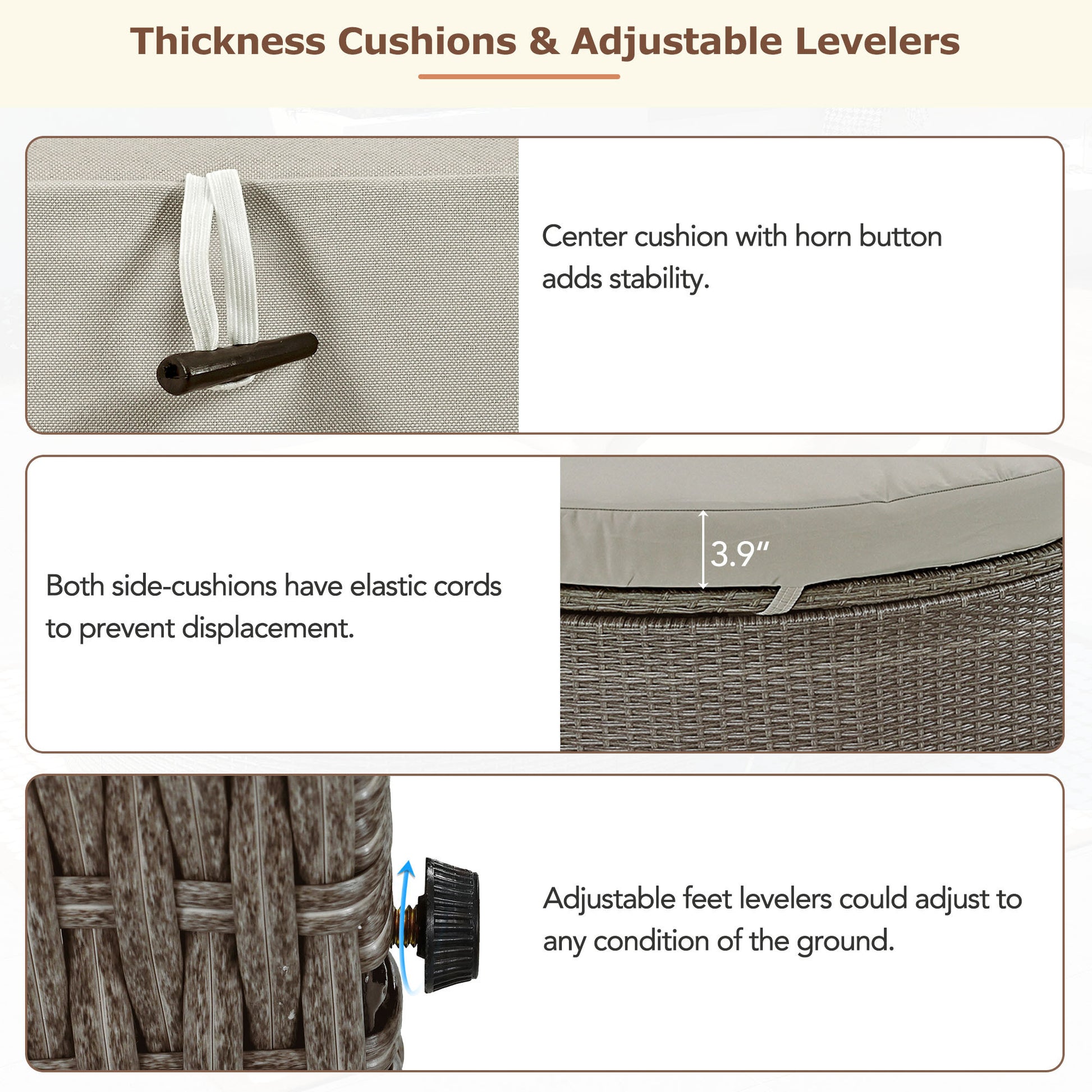 • [Coussins d'épaisseur et niveleurs réglables] Les coussins 6 pièces de 3,9 épaisseurs garantissent une expérience confortable et relaxante lors de l'utilisation de notre lit de repos extérieur. Les dos des coussins des deux côtés sont fixés au cadre en rotin avec des cordons élastiques pour éviter tout déplacement pendant l'utilisation. Des boutons en corne sont incorporés dans les coussins au niveau de la section centrale pour plus de stabilité, garantissant que les coussins restent fermement en place. Les pieds réglables peuvent s'adapter à toutes les conditions du sol.