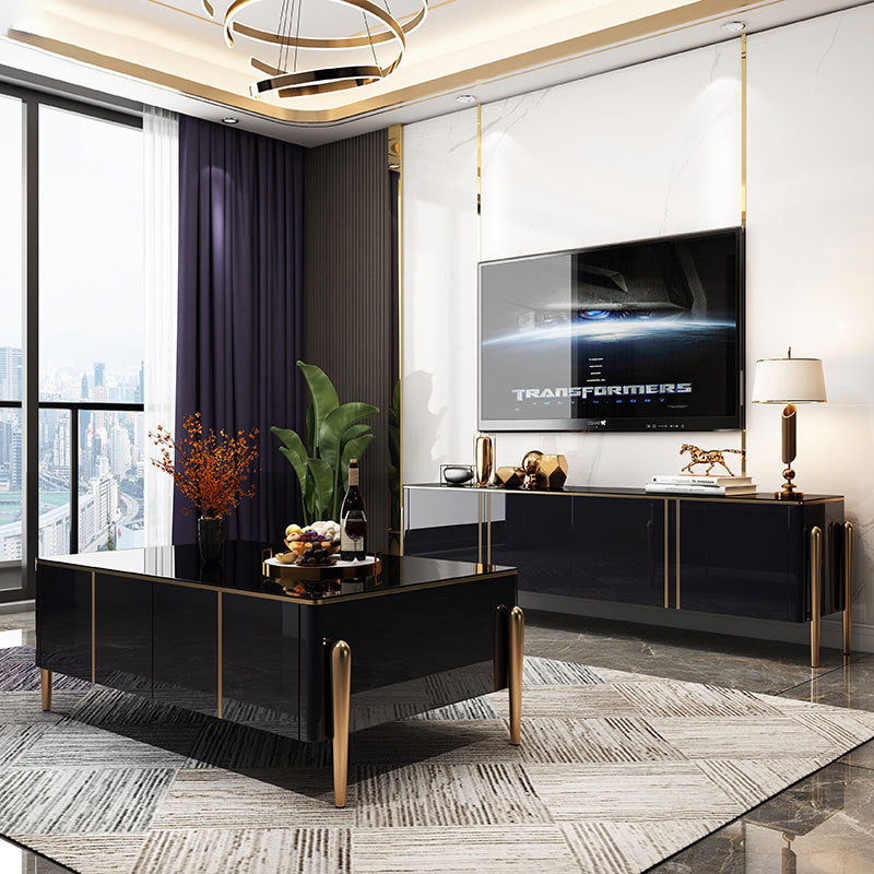 Conception rectangulaire ou carrée moderne de table basse noire avec le dessus en verre de jambe d'or