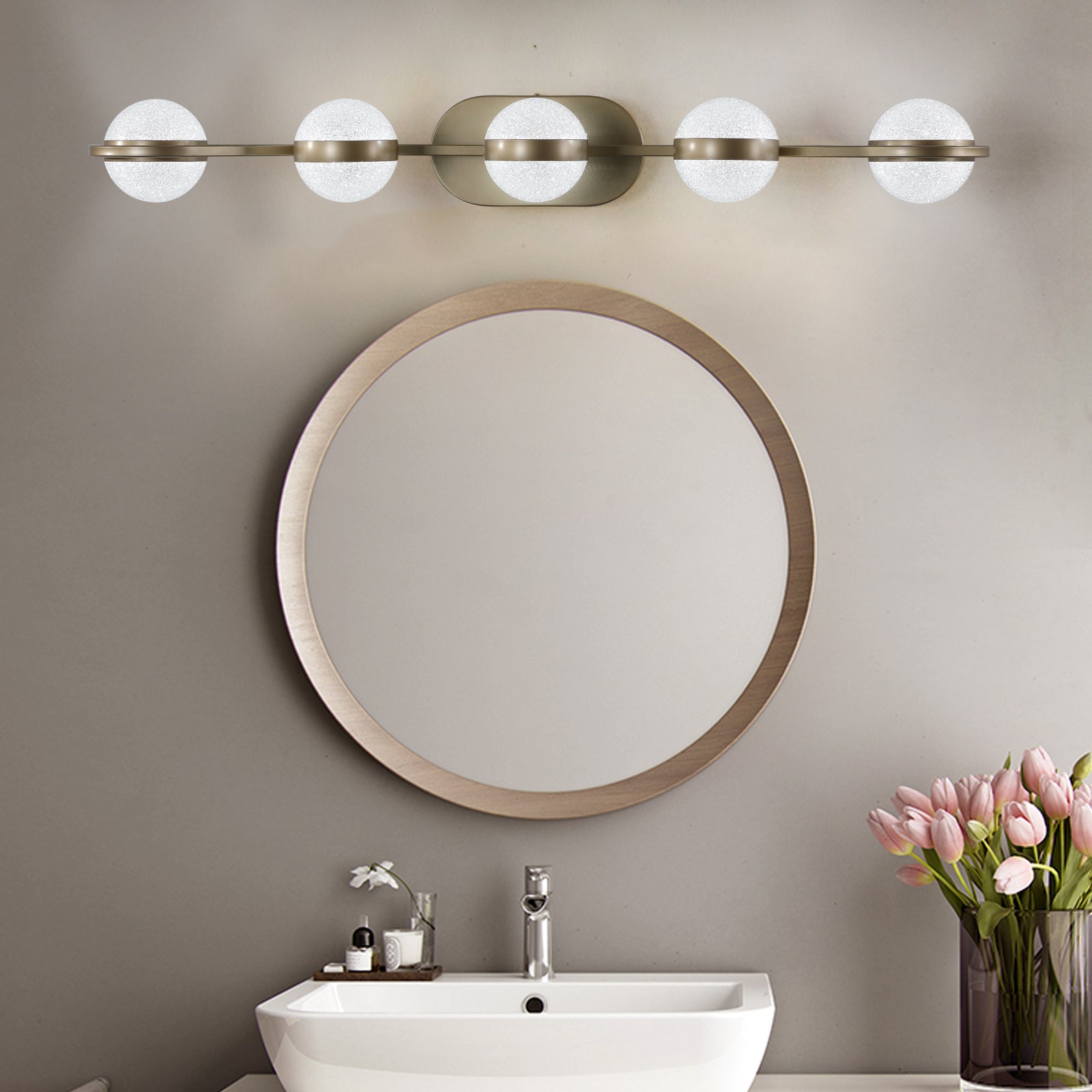 [MODERN&ELEGANT DESIGN]:Premium Transparent Lampshades more brilliance to your life,simple and luxurious design makes it durable decoration for your home.Inspired by a playful slingshot toy, each fixture features globe lights in a fun Mid-century Modern arrangement. [APPLICATION]: 5 Lights bathroom Vanity Lighting. Modern and simple style design, suitable for your bathroom, mirror cabinets,powder room, bedroom and living room etc. Modern vanity light brightens your living instantly. [ENERGY SAVING]:LED Light Sourcecreates stable and efficient light.LED technology saves up to 80% electricity [Finish]: Champagne Gold [Height centre of Wall Opening]: 2.6 Inch [Material]: Acrylic [ Average Hours]: Integrated soft white (6000K) light