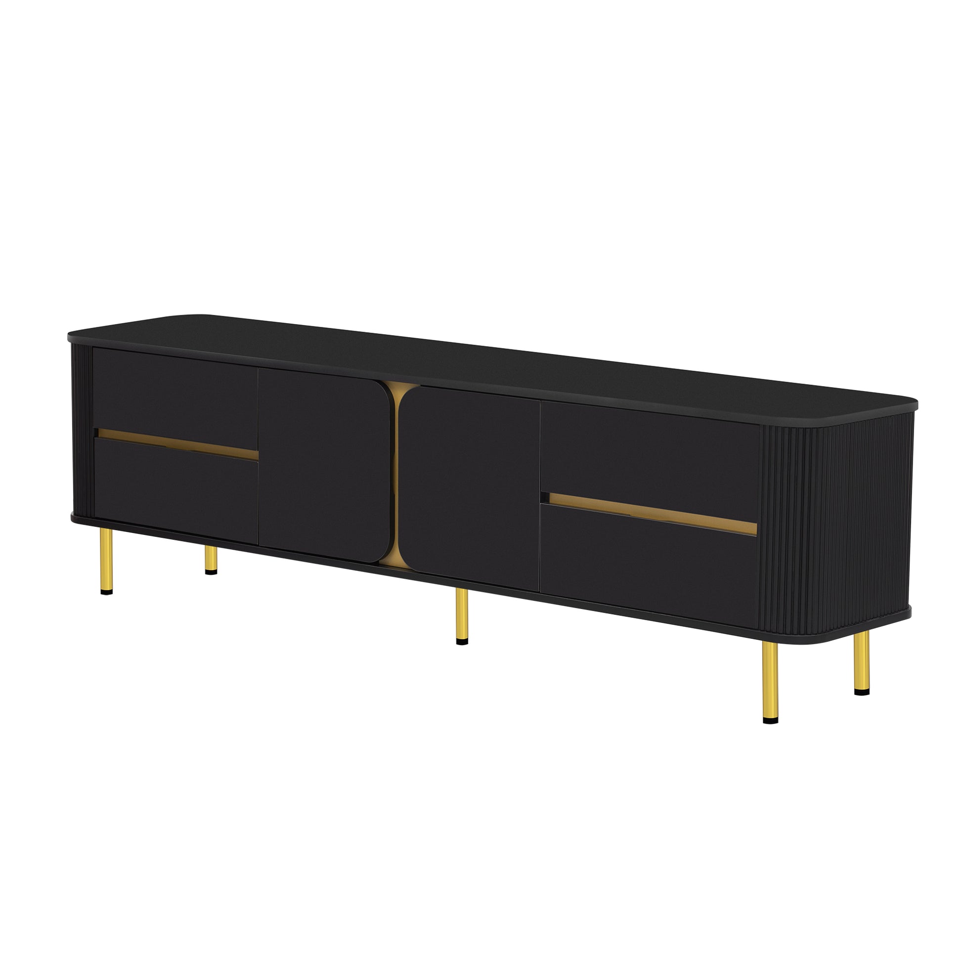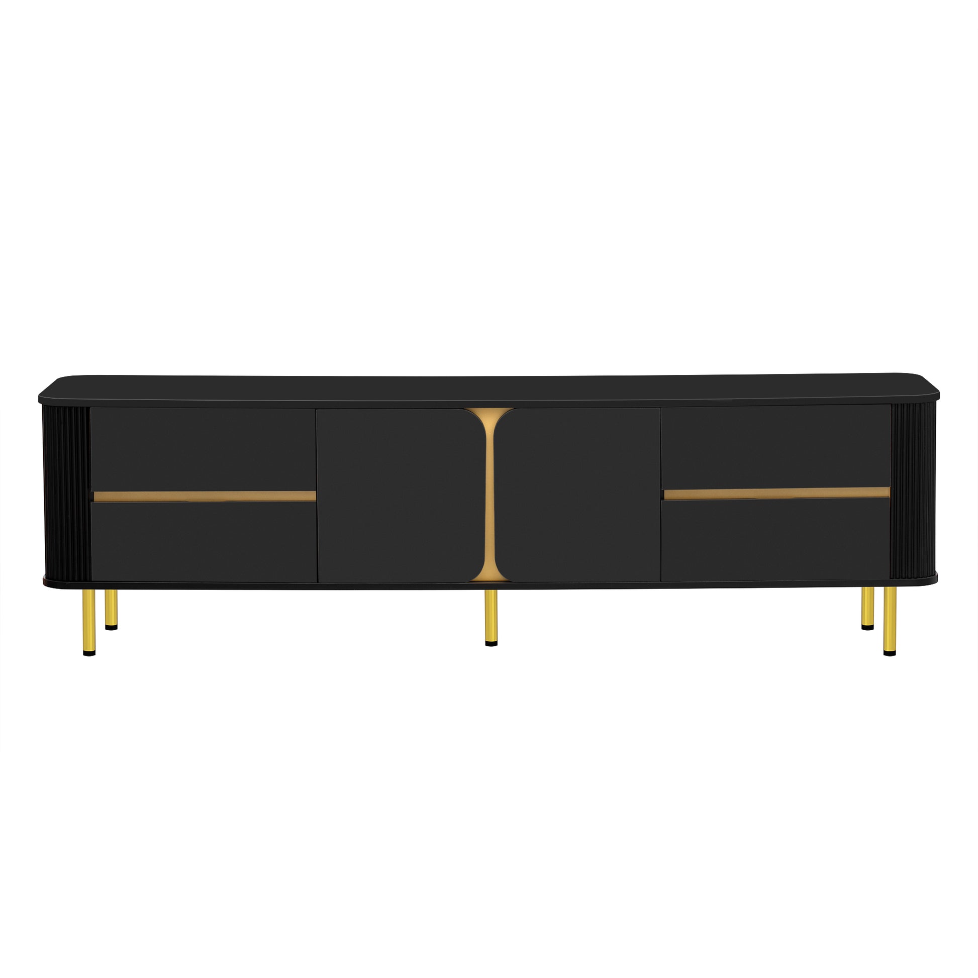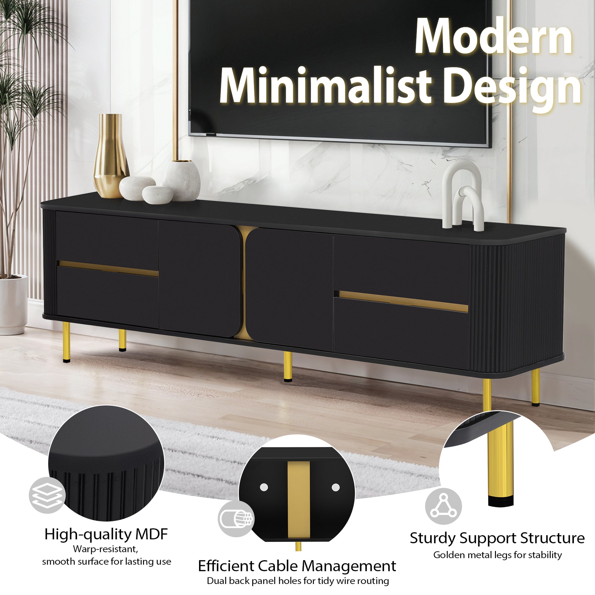 • Including 4 drawers that offer hidden storage for remote controls, DVDs, gaming accessories, and other essentials to keep your living area clutter-free and organized. 1 spacious cabinet is separated into two spaces by a board with golden surface, creating a visually appealing contrast within the TV stand. Perfect for storing larger items, such as speakers, gaming systems, or decorative pieces.