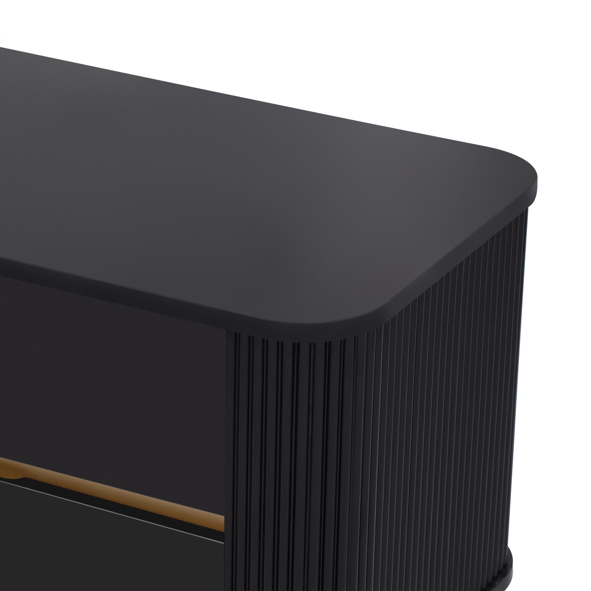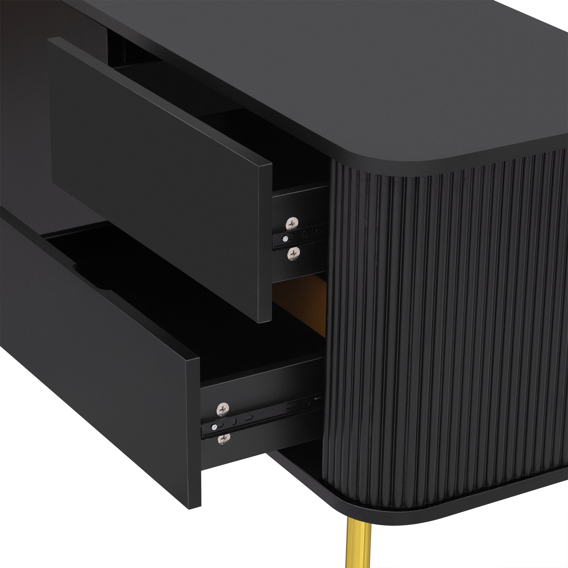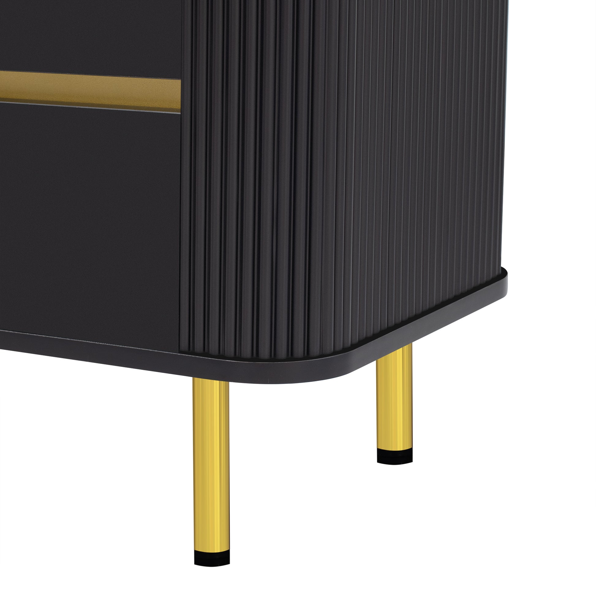 • Including 4 drawers that offer hidden storage for remote controls, DVDs, gaming accessories, and other essentials to keep your living area clutter-free and organized. 1 spacious cabinet is separated into two spaces by a board with golden surface, creating a visually appealing contrast within the TV stand. Perfect for storing larger items, such as speakers, gaming systems, or decorative pieces.
