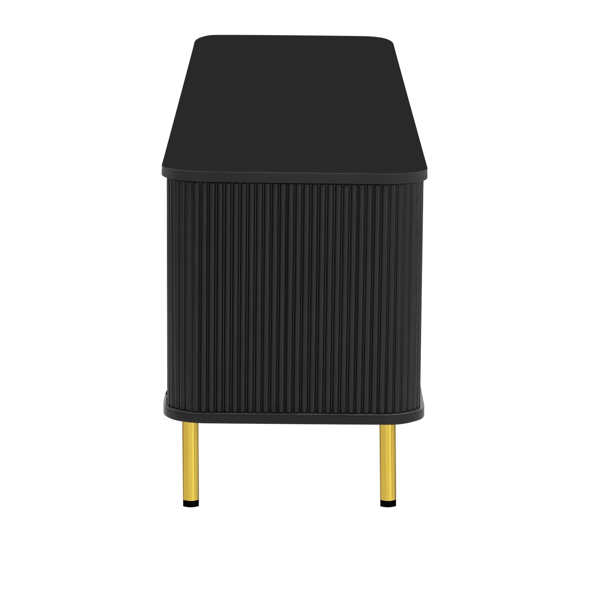 • Crafted from premium materials, this TV stand is designed to withstand the test of time while maintaining its aesthetic appeal. The use of high-quality MDF ensures a smooth, durable surface that resists warping and damage. And supporting the TV stand are five golden metal legs that provide both stability and a touch of luxury.