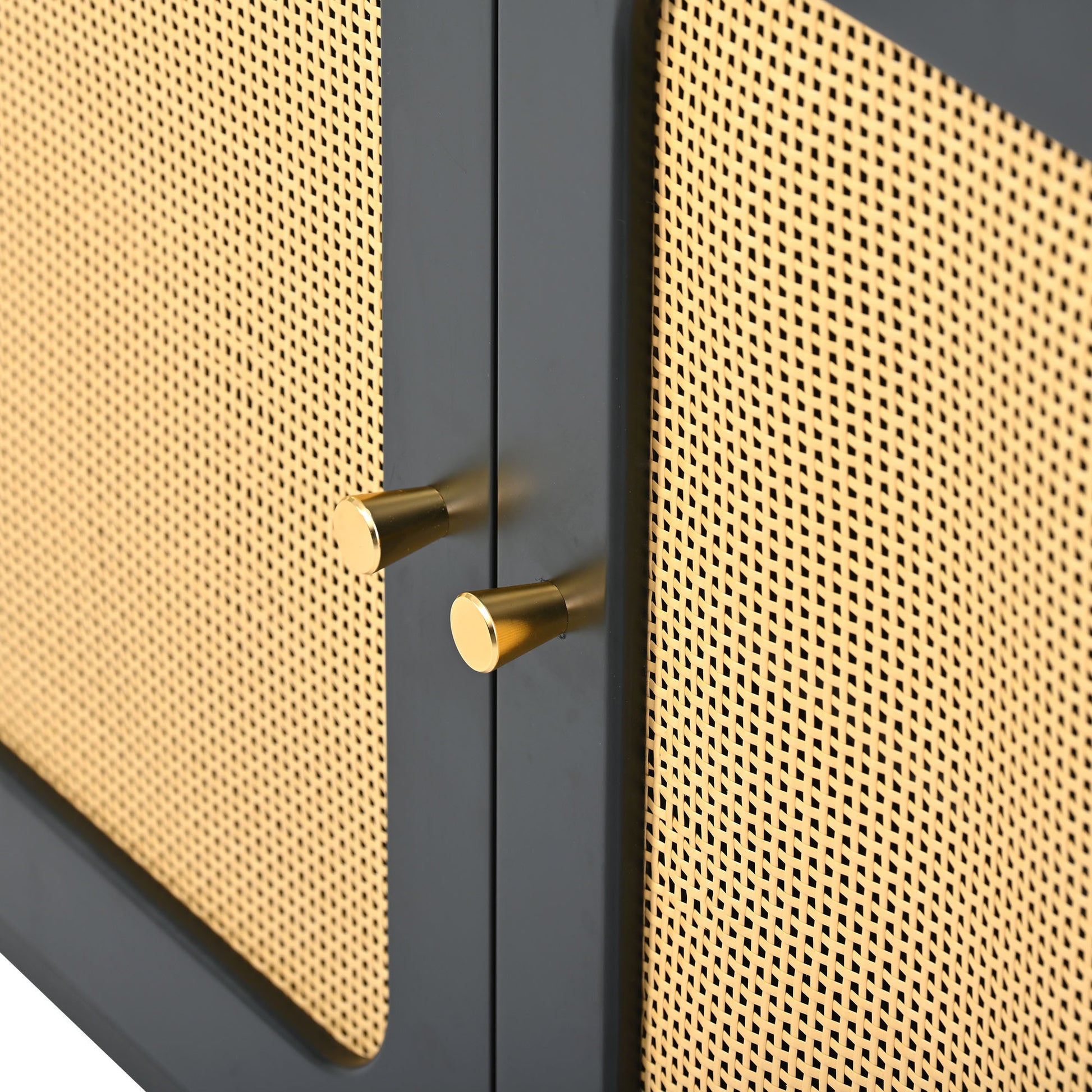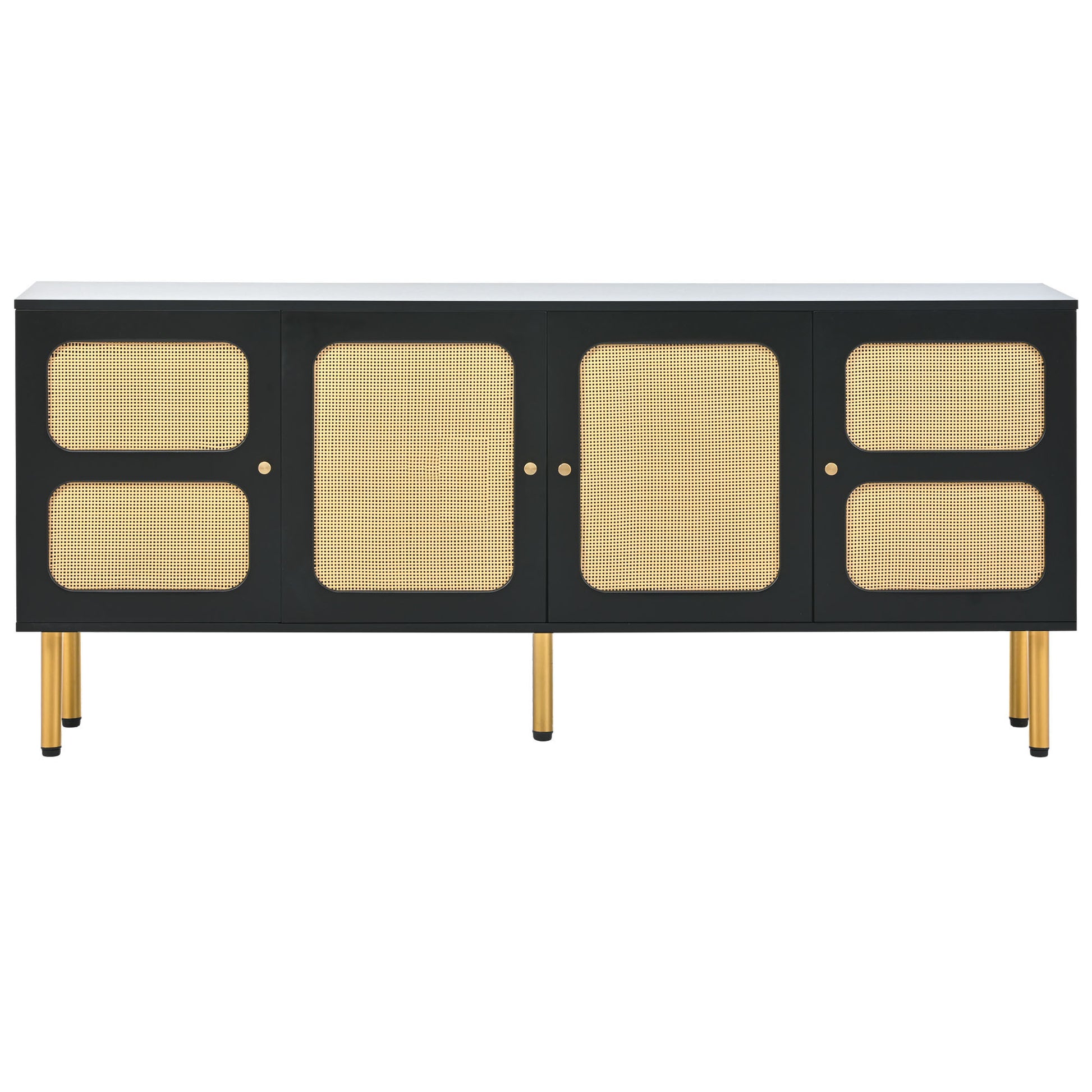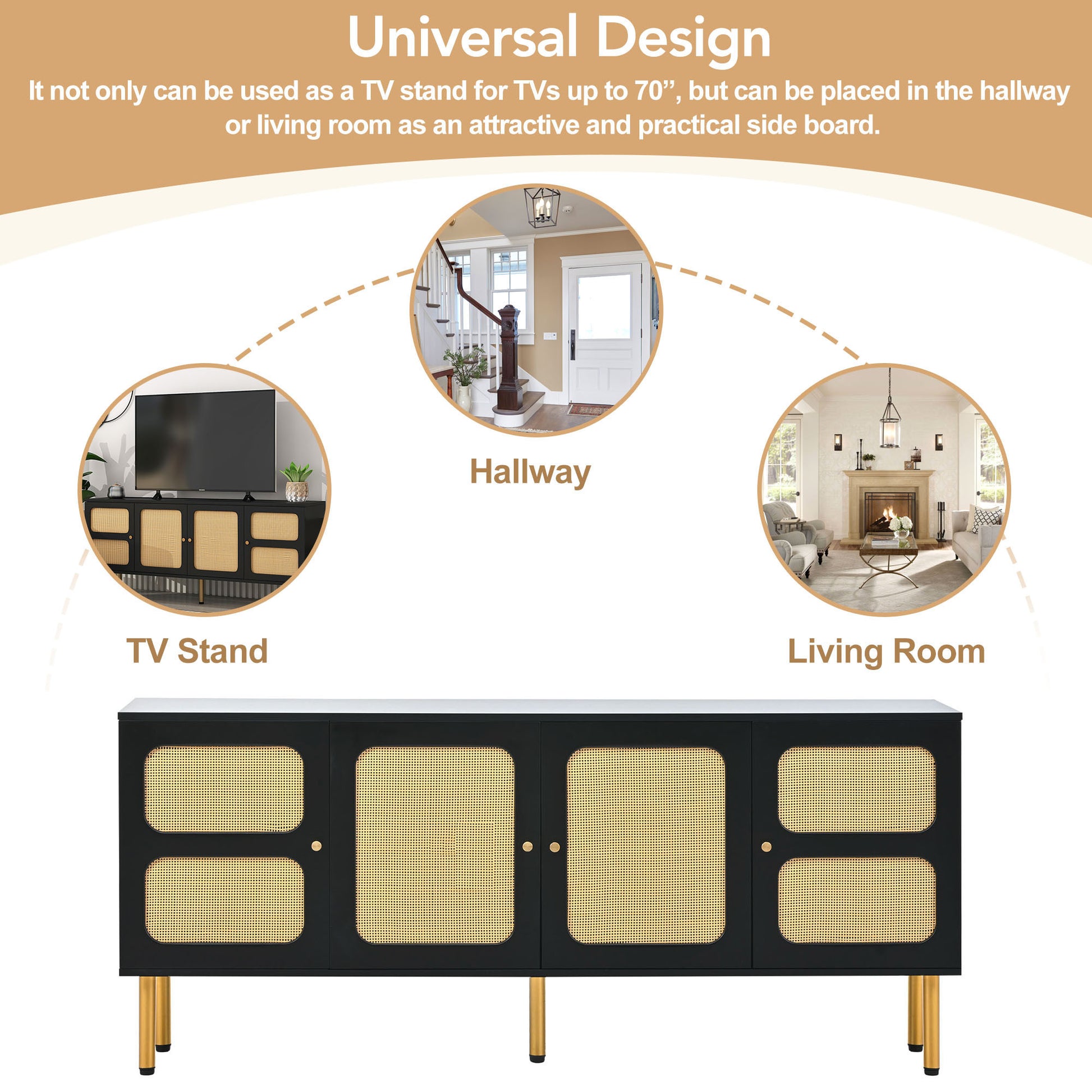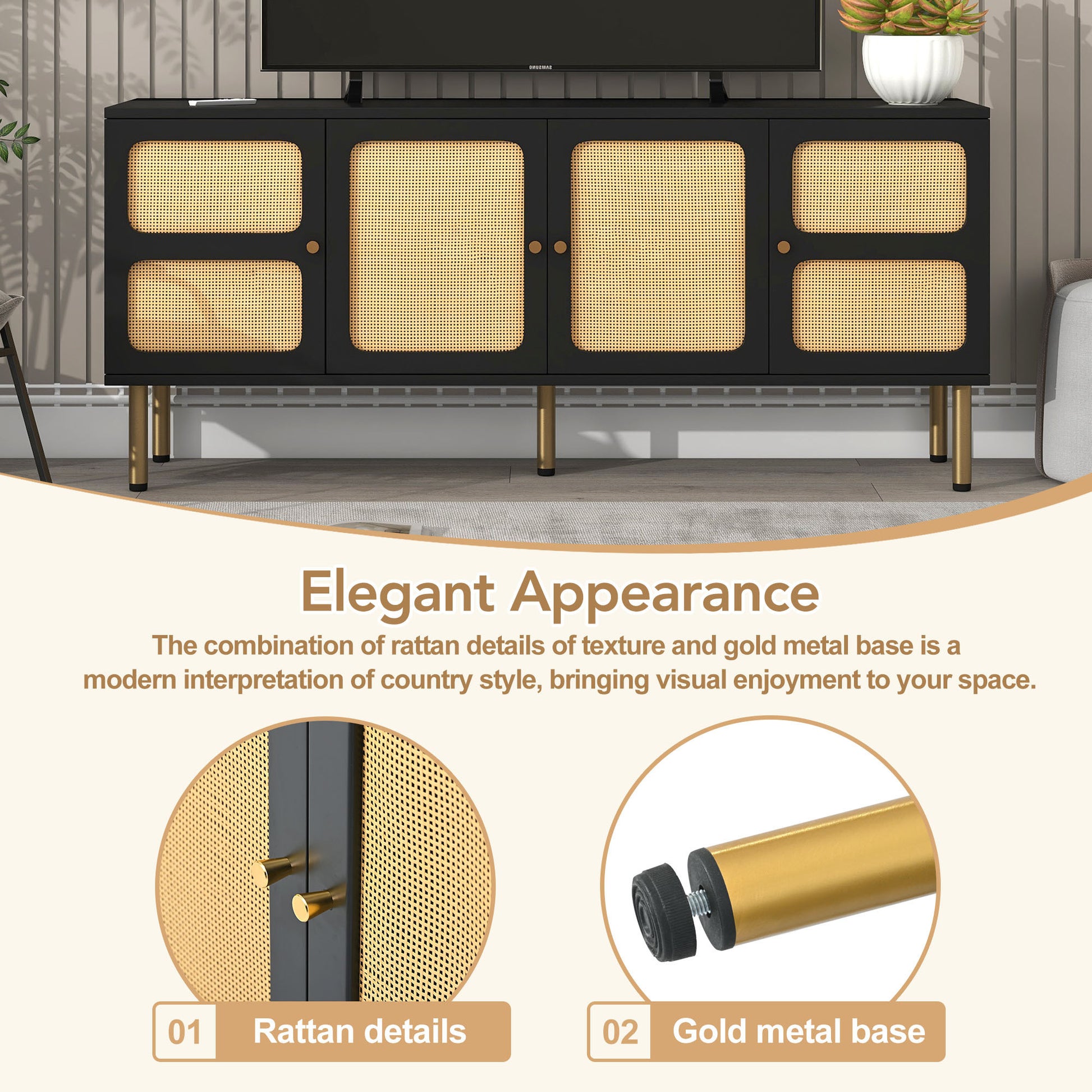 Meuble TV de style bohème ON-TREND avec porte en rotin, table console multimédia tissée pour téléviseurs jusqu'à 70", panneau latéral de style campagnard avec base en métal doré pour le salon, noir.