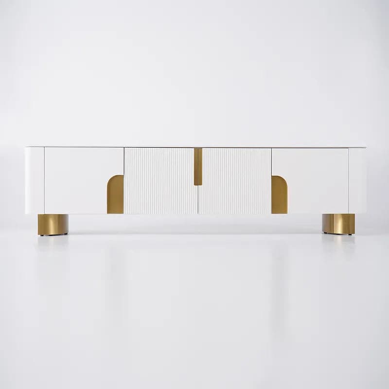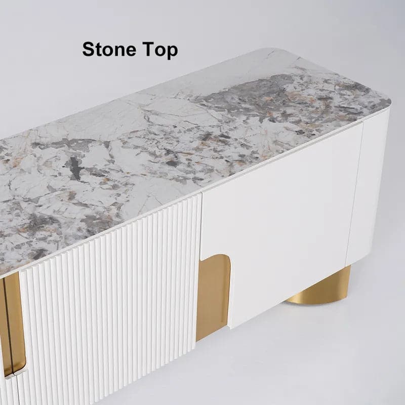Meuble TV moderne beige avec dessus en pierre 4 portes avec console multimédia de rangement pour téléviseurs jusqu'à 85"