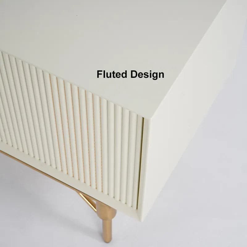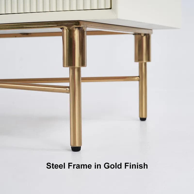 Moderne et frais, ce meuble TV moderne combine rangement ouvert et fermé afin que vous puissiez maximiser votre environnement de divertissement. Les six pieds avec une finition dorée interconnectés de manière croisée pour améliorer la durabilité et l'attrait esthétique sont assurés. Ce meuble télé blanc cassé avec quatre tiroirs et portes est parfait pour les chambres à coucher, les pièces standard, les salons de télévision ou les réunions. Sa forme rectangulaire confère un air de modernité et de raffinement au design autrement sobre de la pièce.