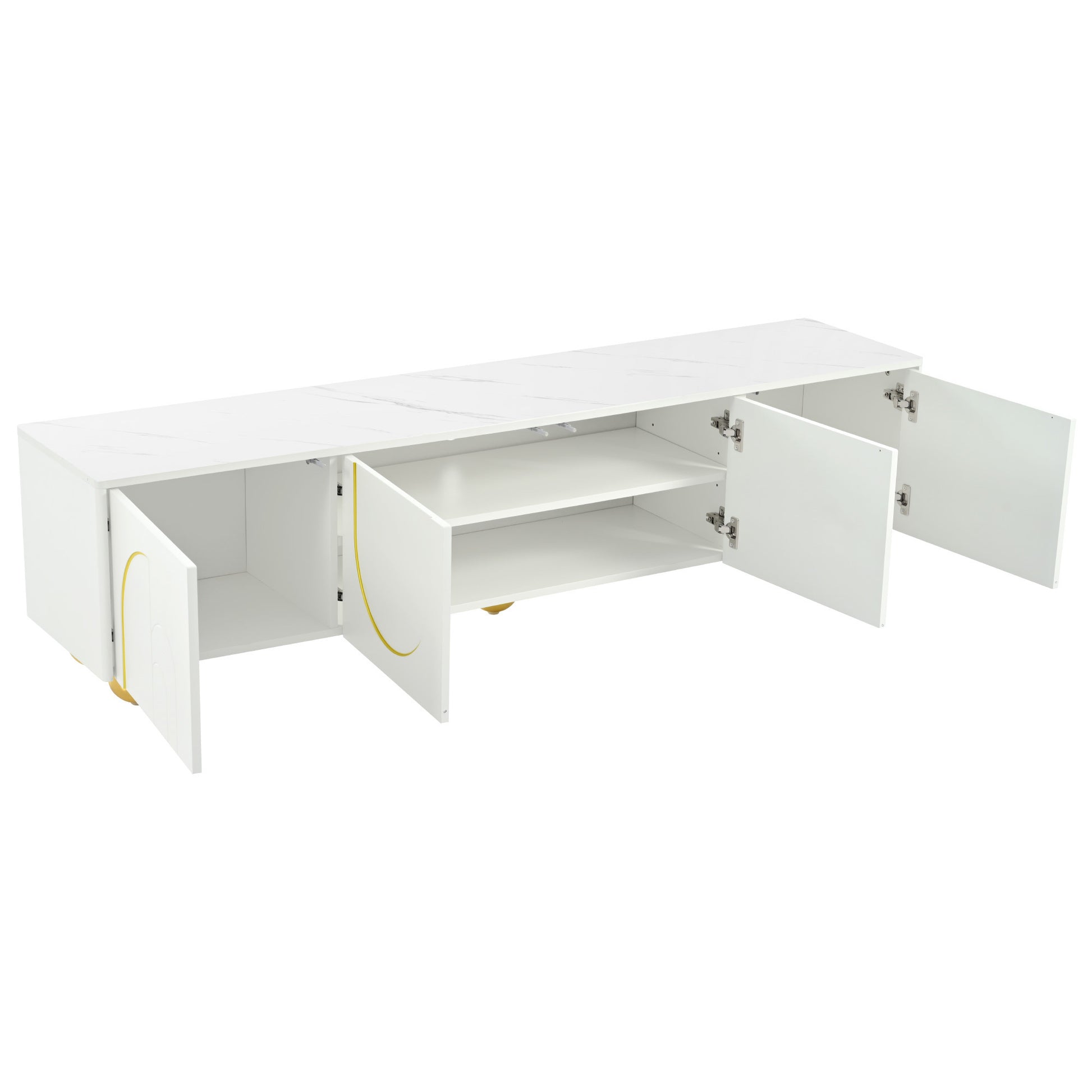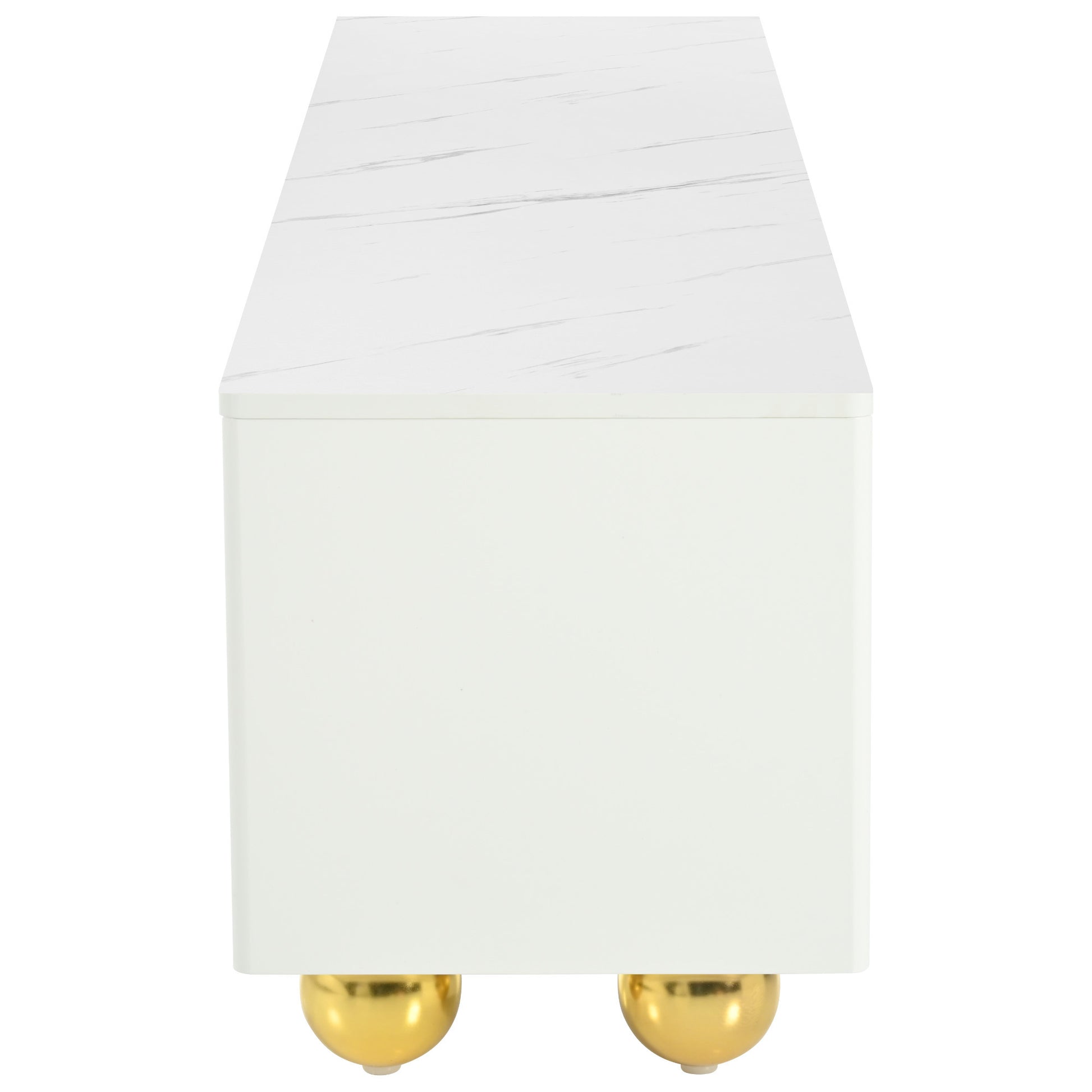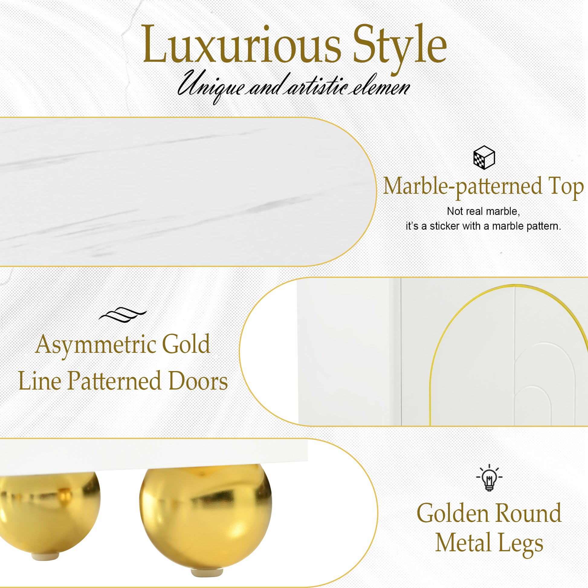 Upgrade your living space with this modern TV stand! The marble-patterned top, asymmetric gold line-patterned doors and golden legs make this unit not more than just a piece of furniture—it's a statement of luxury, style, and sophistication. Whether you're furnishing a chic urban loft or a cozy suburban home, this versatile piece seamlessly integrates into any decor style.