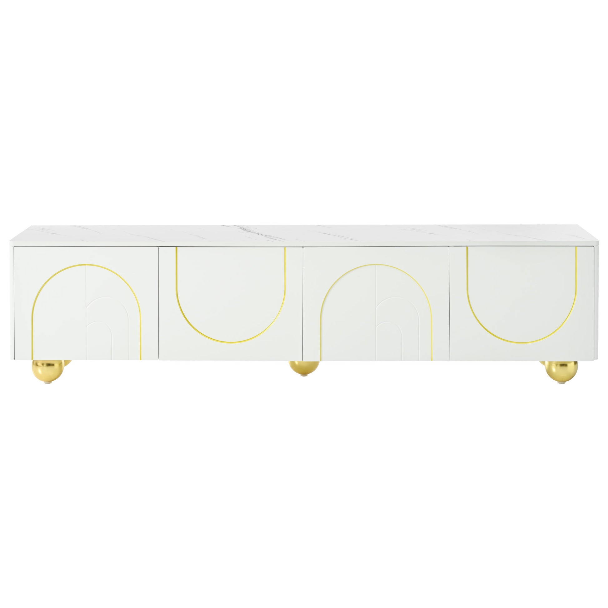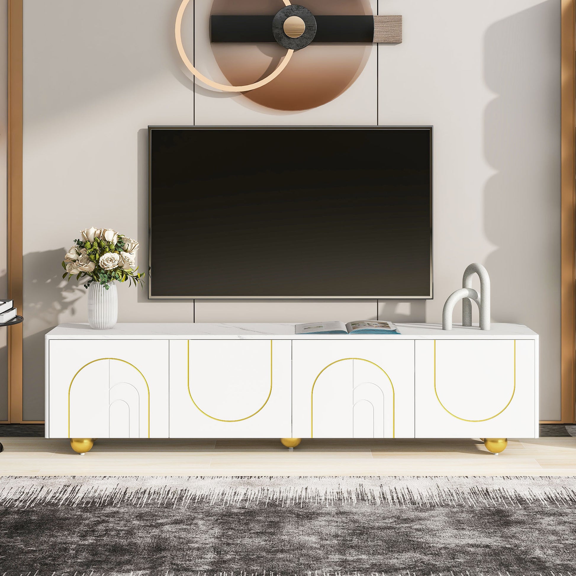 - Featuring four storage cabinets with asymmetric gold line-patterned doors, this piece offers ample space to stow away all your entertainment essentials with ease. Whether it's DVDs, gaming consoles, or audiovisual equipment, the cabinets provide discreet storage solutions that keep clutter at bay while maintaining a clean and organized living space.