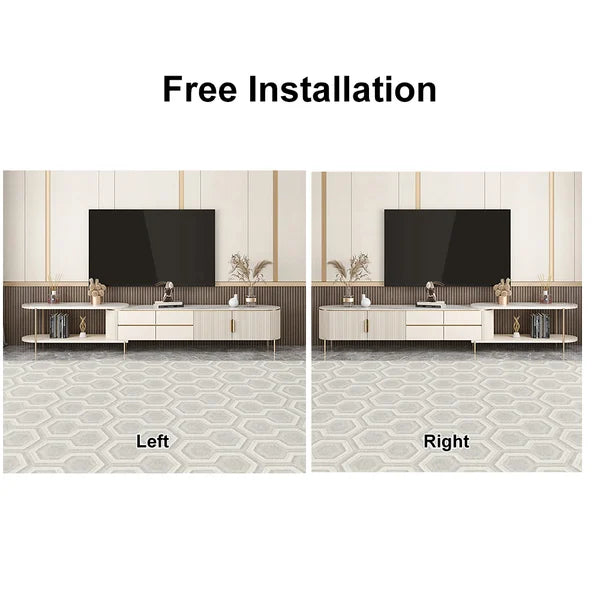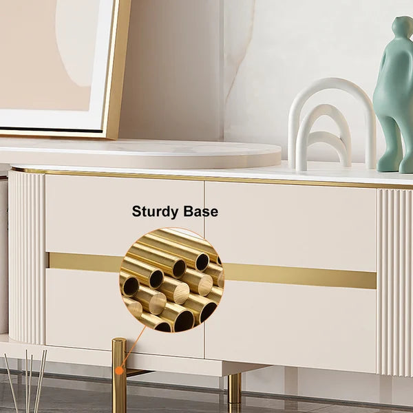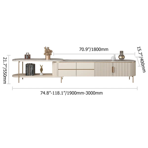 Meuble TV ovale rétractable en pierre frittée blanc cassé, console multimédia avec 4 tiroirs