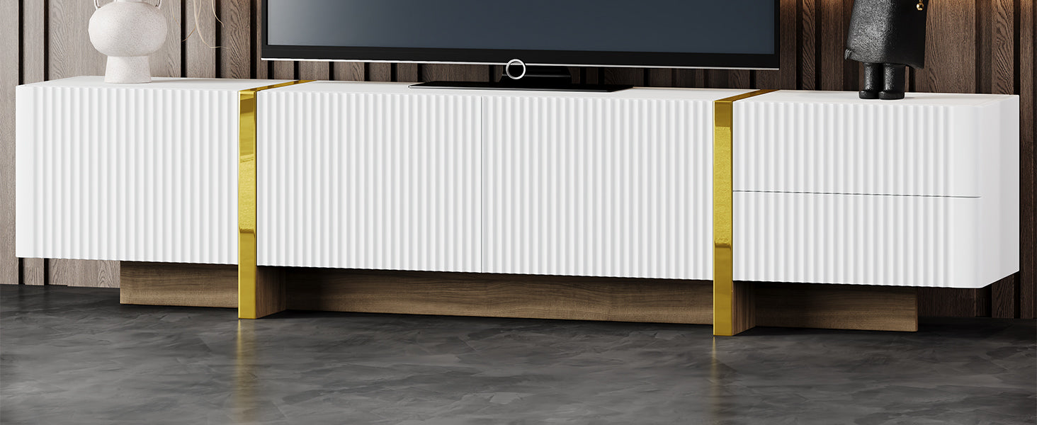 - Featuring smooth fluted panels and golden wood grain legs, this TV stand emanates a luxurious elegance that harmoniously complements a wide range of modern furniture styles.