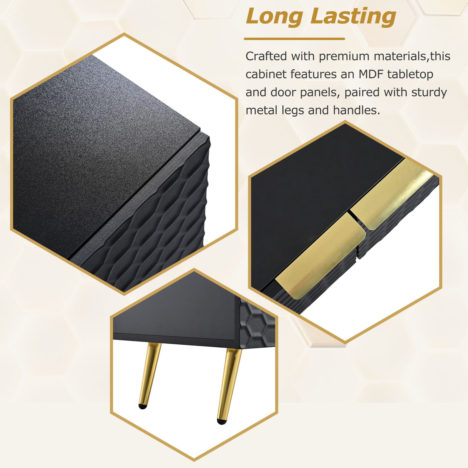 This TV cabinet exudes contemporary elegance with its sleek and minimalist design. The honeycomb pattern on the door panels adds a unique visual feeling, while the gold handles and legs complement the modern aesthetic, elevating the overall look of living space.
