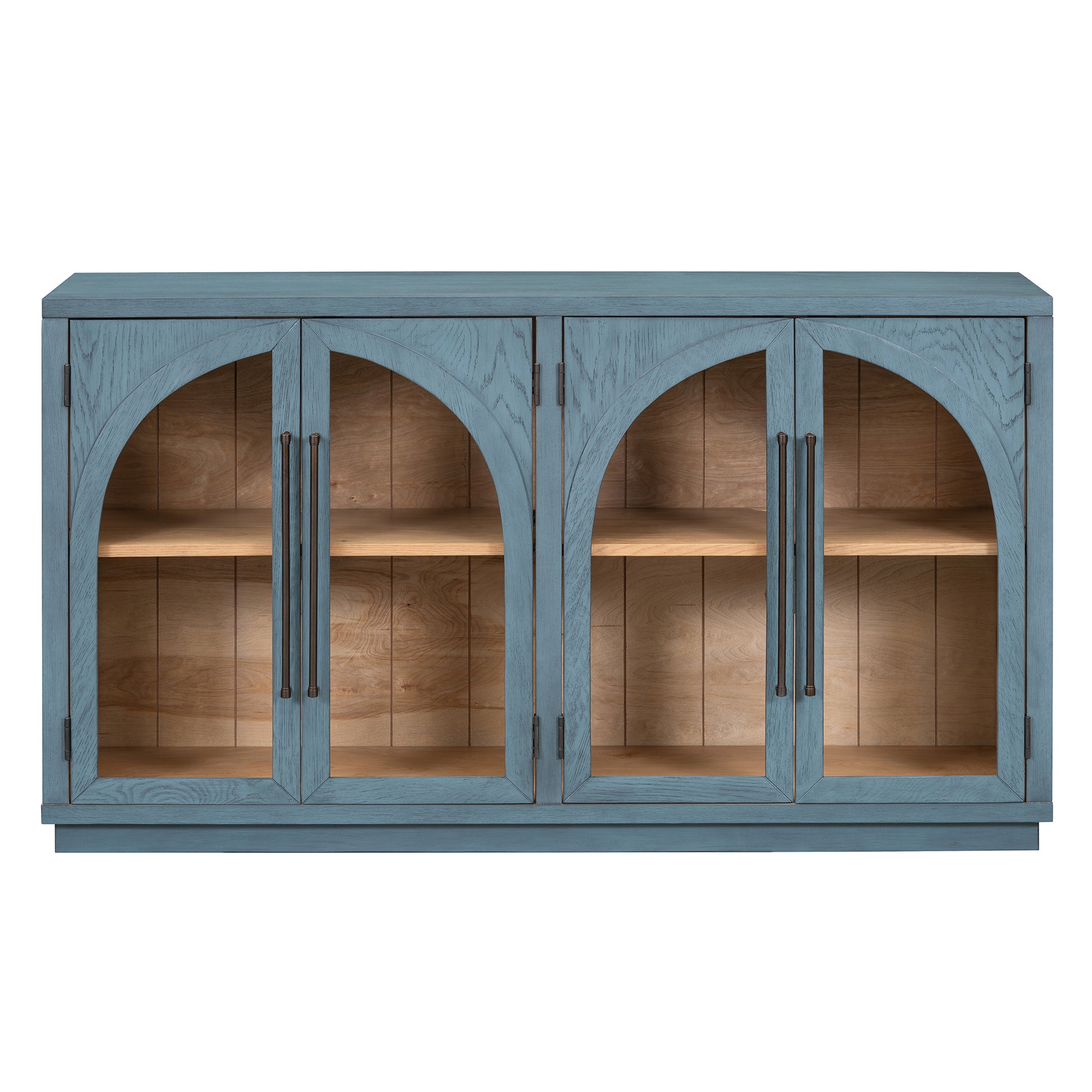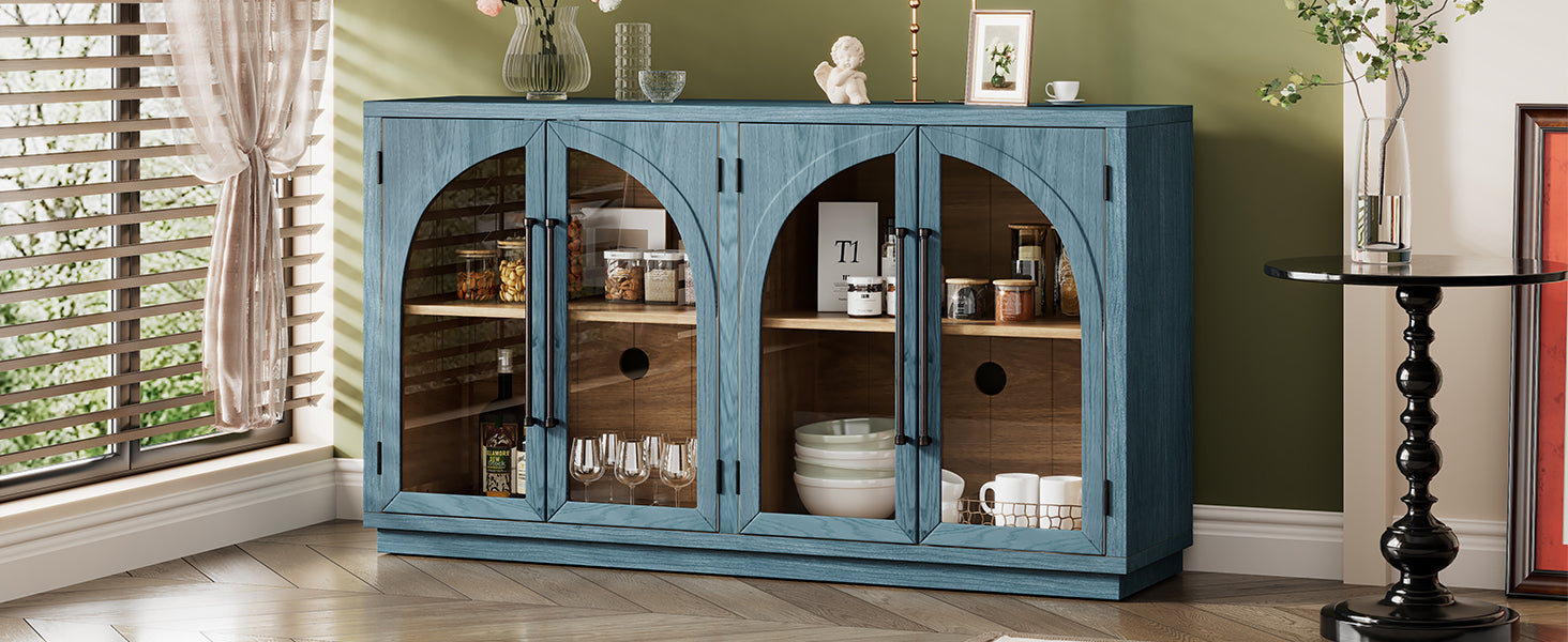 - Unique Design: Traditional retro style sideboard, very classic and low-key, makes your furniture look more natural and beautiful. The arched design of four cabinet doors and the superior glass material make this sideboard add uniqueness and personality. Equipped with four convenient and durable metal linear long handles, and clear line in the backboard as opening the cabinet door, this sideboard is more beautiful and practical.