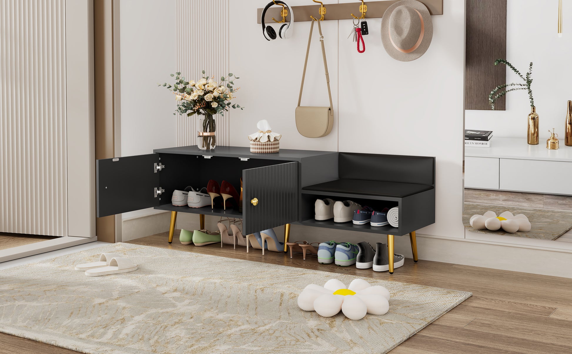 - Stunning Details: This modern storage bench of clean lines going with any environment is a sleek and functional addition to any contemporary space. Crafted with sophistication in mind, this bench features metal handles and metal legs, adding a touch of industrial flair to its design. The door panels are intricately carved with grooves, enhancing its visual appeal and creating depth and texture. Perfect for storing shoes or other essentials, this bench seamlessly combines style and practicality.