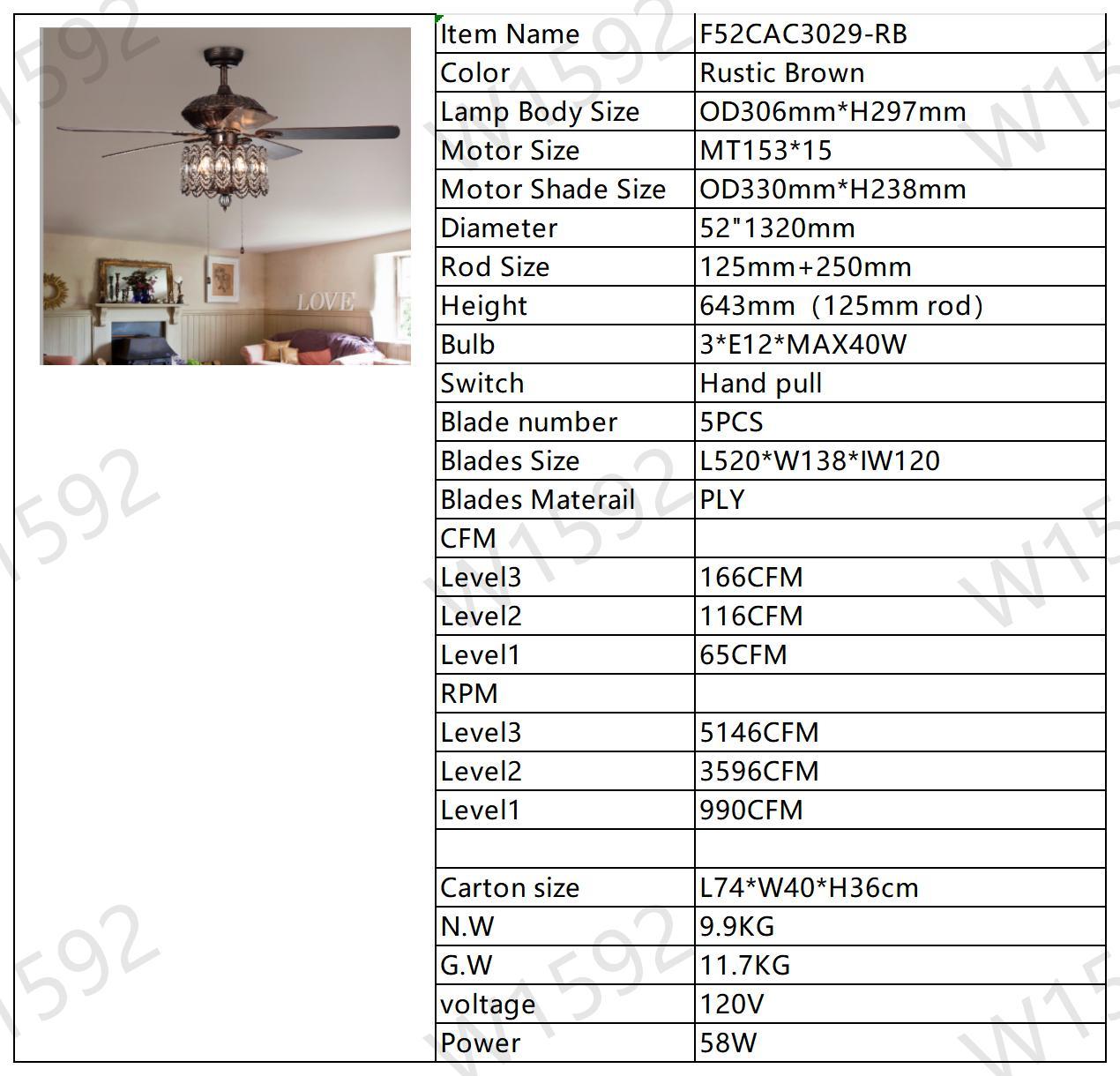 52'' Classical Crystal Ceiling Fan Lamp,3 Speed , 5 Reversible Blades for Living Room, Dining Room, Bedroom, Family Room, Rustic bronze ,3PCS*E12 (NO Include Bulb, Hand Pull Chain)