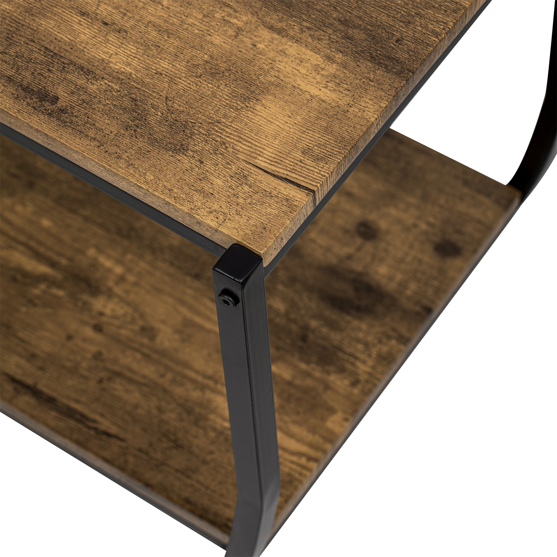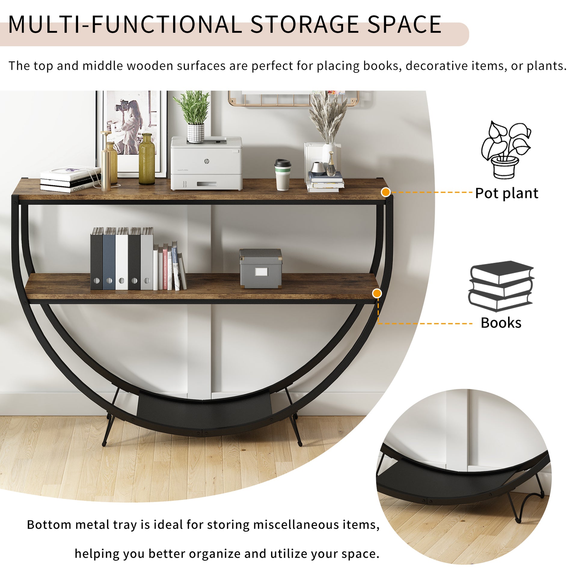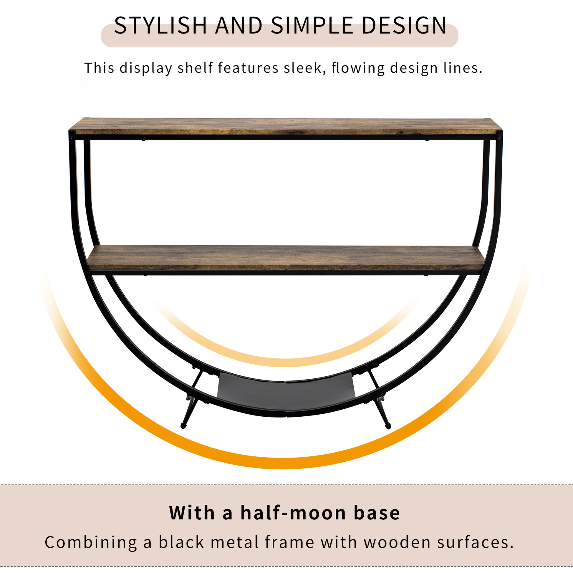 Its base showcases a demilune shape awash in an antique black finish and a metal lower shelf lends a touch of industrial charm.Two tiers of wood shelving offers large space for your books, magazines and decor.