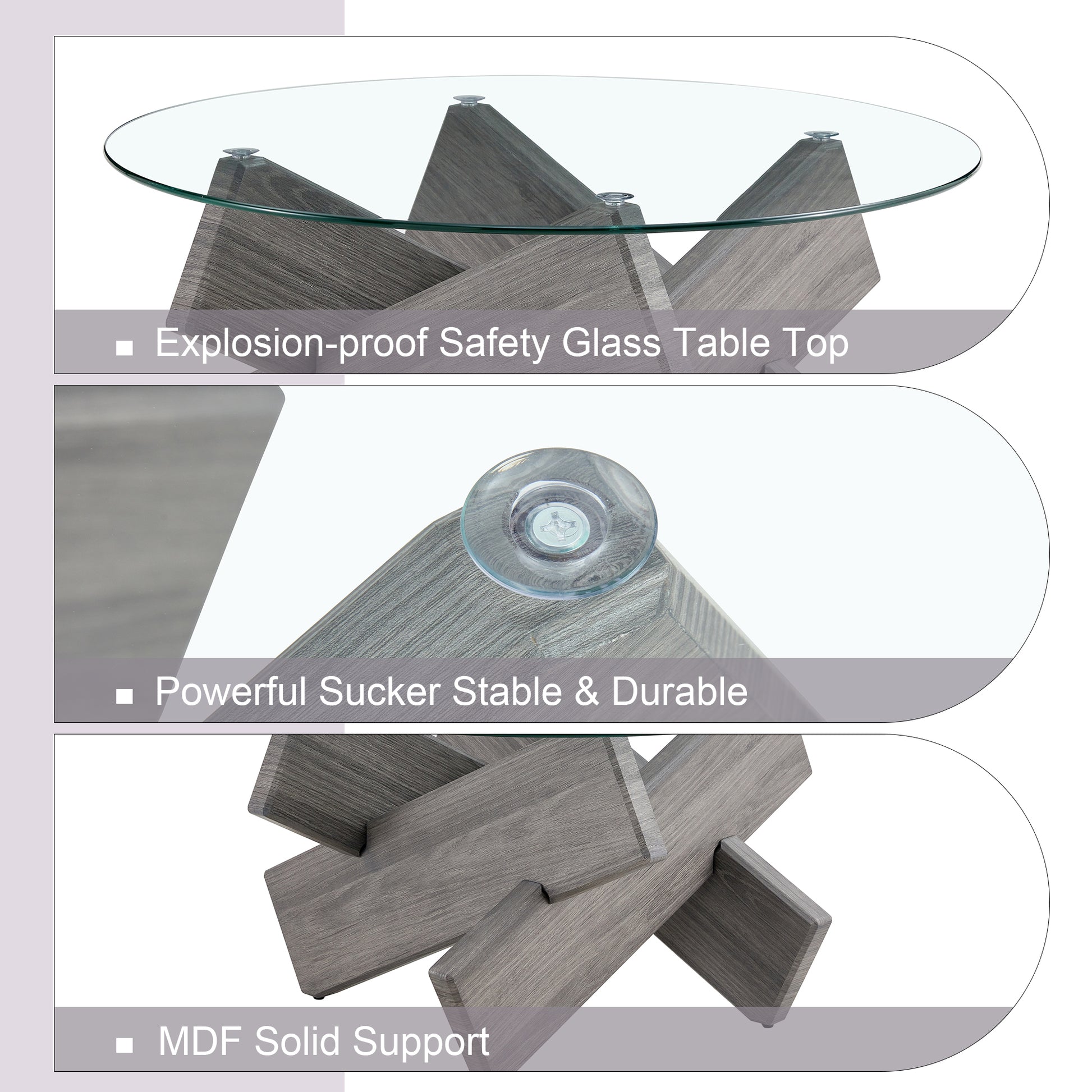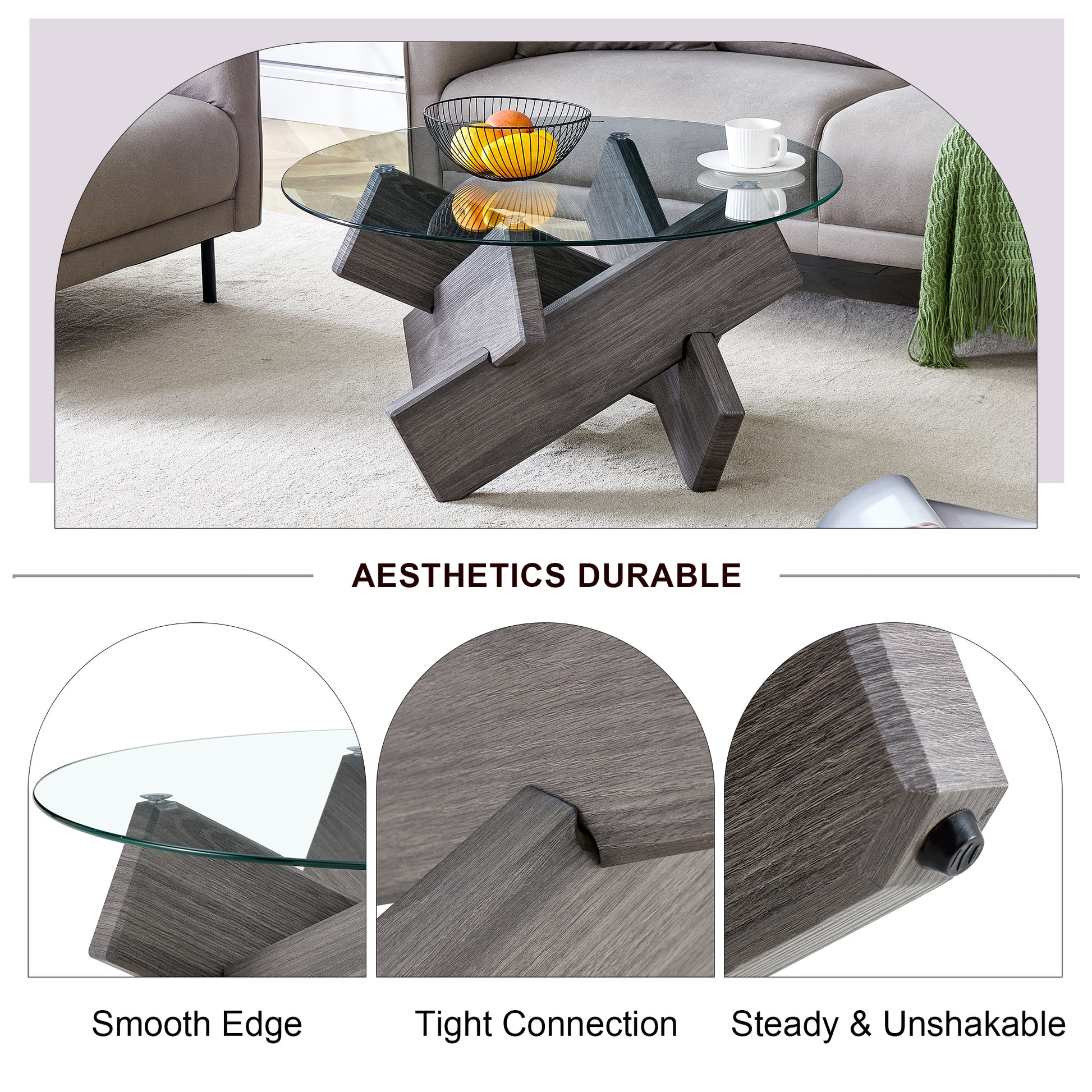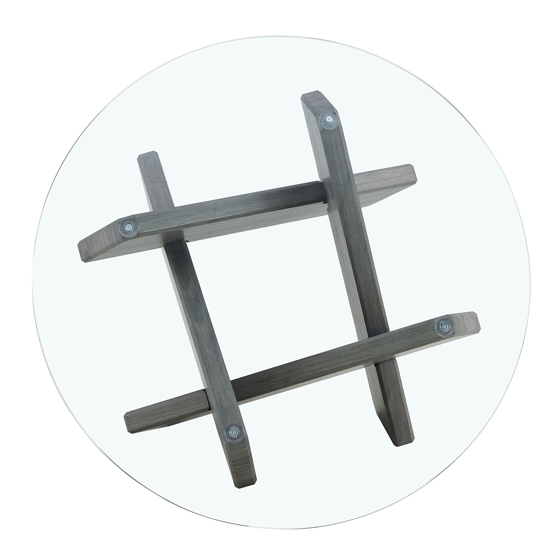 - Modern round glass coffee table with clear tempered glass top and grey patterned MDF legs.Tempered glass tabletop is very sturdy, wear-resistant and impact resistant, suitable for long-term use.