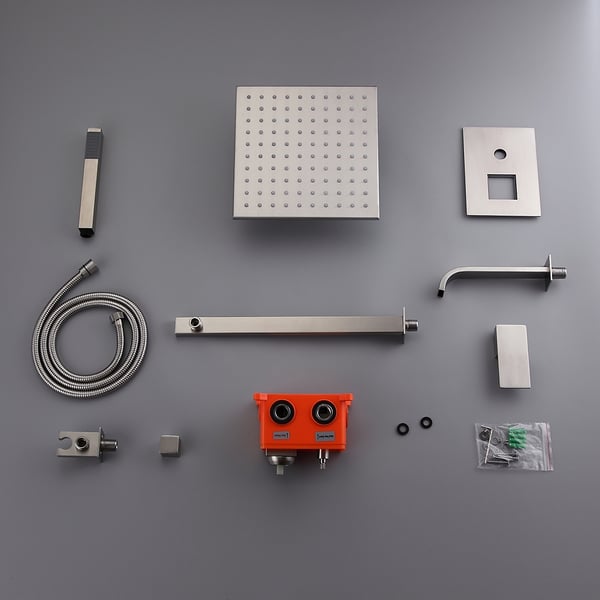 - Includes 10" (250mm) rain shower head, wall mount shower arm, hand shower parts, a tub spout and 3-function shower valve.