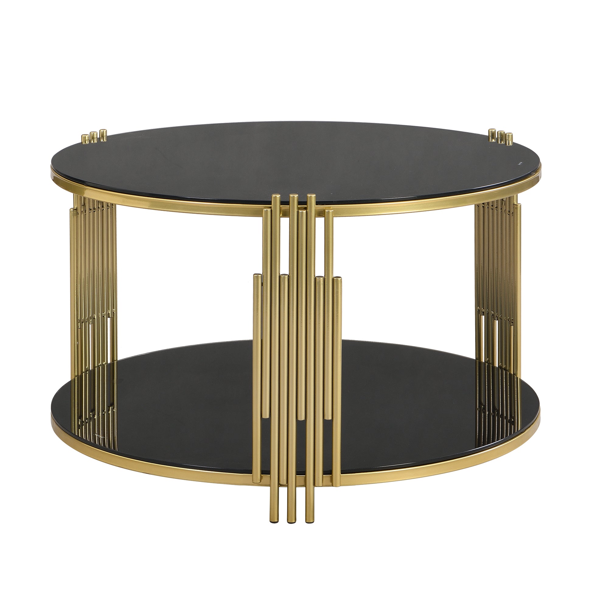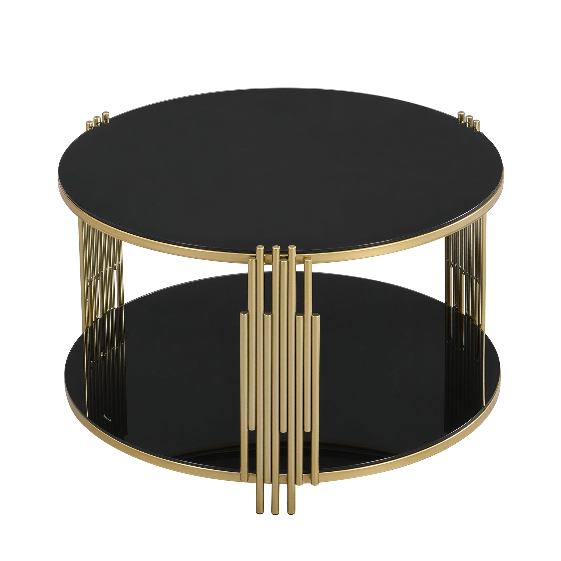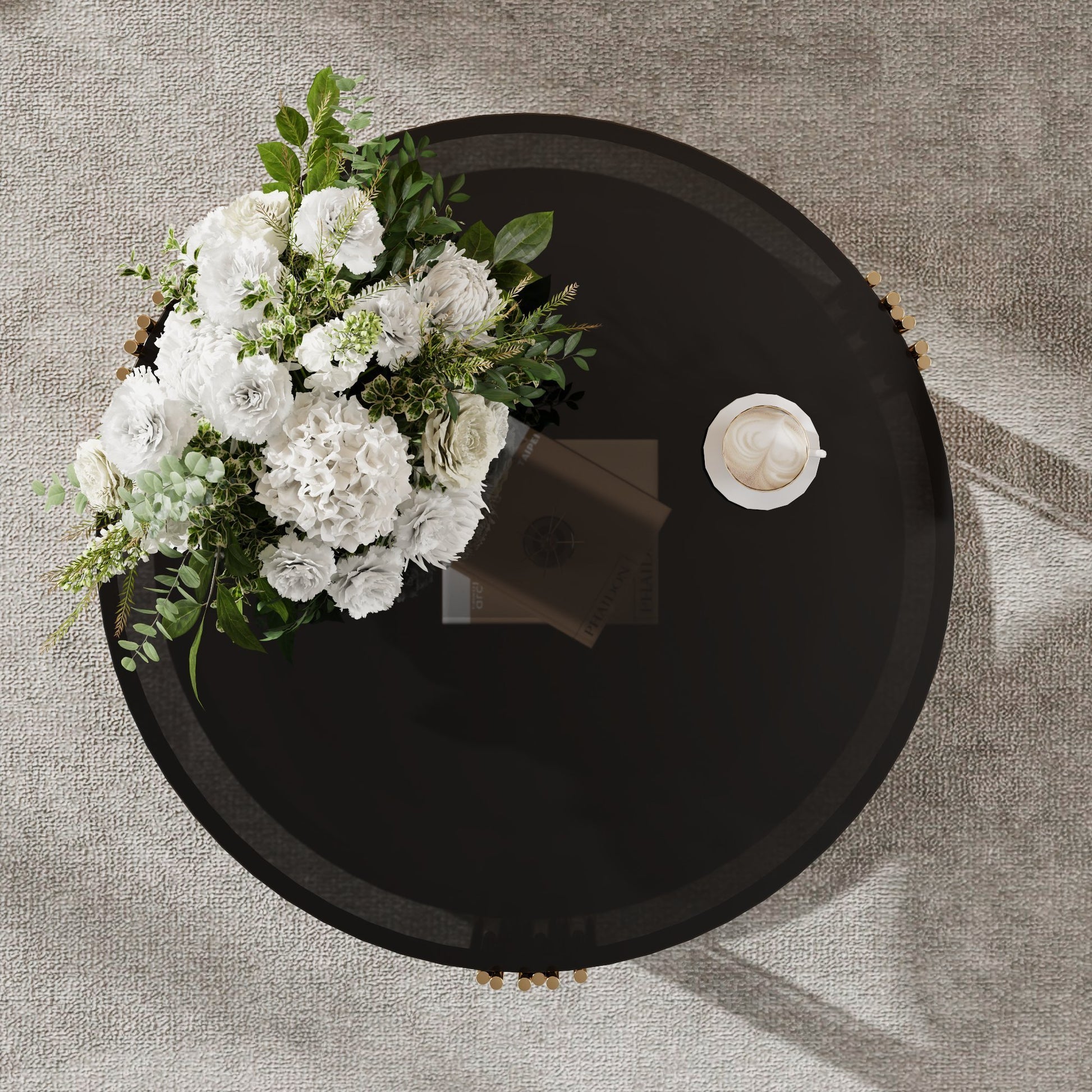 - Circular Metal Drum Base: The coffee table is supported by a circular metal drum base with a gold finish. The base provides stability and a luxurious contrast to the black mirror top, enhancing the table's overall style.