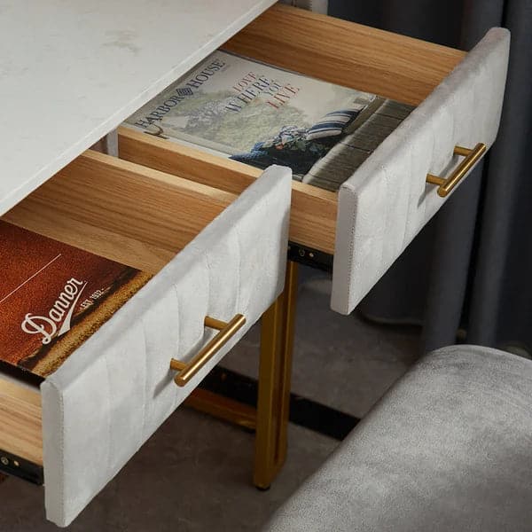 - This cosmetics vanity set will look great in your bedroom and serve a practical purpose. It is an elegant new look for the house that may be achieved with this makeup vanity desk, which has a faux marble top and velvet upholstery throughout.