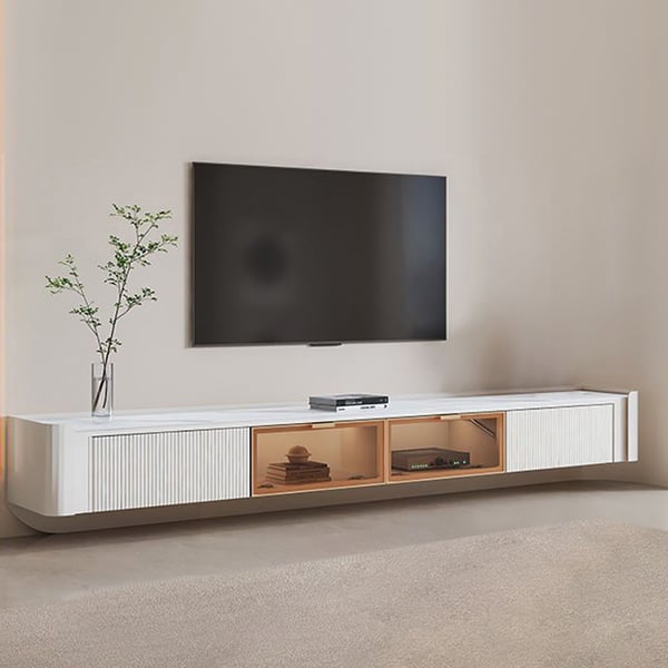 This elegant wall-mounted tv stand can bring your living room a wonderful space arrangement without standing on the floor. With the fluted front surface design, a soft line, and the whole product arises a modern style and well deco for your room decoration. The top of the tv stand comes up with sintered stone materials that have the advantage of being anti-scratch, fireproof, and easy to clean. This is definitely the best choice for you.